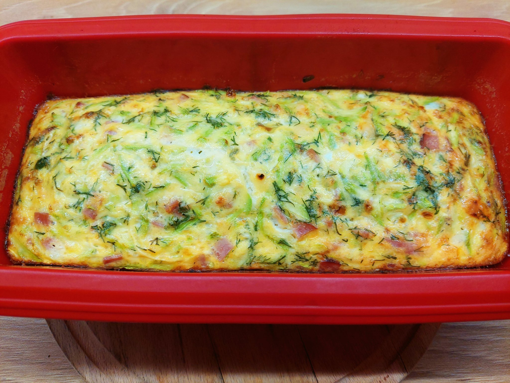 Омлет за утрешната закуска с тиквички, шунка и сирене.