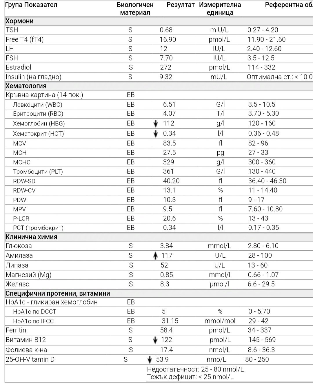 На 26 съм, изследванията са правени след (умишлено) сваляне на много килограми, на метфогама и оземпик съм за ИР. Доколкото разбирам, е нормално да ми е по-нисък б12, заради метформина. Също така съм вегетарианка от почти 15 години. Тези обстоятелства обосновават ли резултатите от изследванията или се налага да си пускам нещо още? Според вас налага ли се консултация с някакъв лекар или мога сама да си взема добавка с витамин б12? Фолиевата киселина е в референтни стойности, налага ли се и нея да я пия профилактично? Хемоглобинът от години ми е нисък, личният лекар каза, че му прилича на желязодефицитна анемия, но единствено ми е препоръчал да гледам да ям храни по-богати на желязо. Малко ме озадачава това, защото като гледам желязото си ми е в норма, макар и на долната граница. На своя глава съм си взимала билкова кръв няколко пъти, като че ли съм се чувствала по-енергична като съм я пиела. Витамин Д пия, него го следи ендокриноложката ми. Иначе мога да кажа, че винаги съм си била с по-ниско кръвно, завиване на свят при резки движения или изправяне и т.н., но не е нещо ново и не ми е правило впечатление, сега виждам, че е възможно тези фактори да са от значение.
