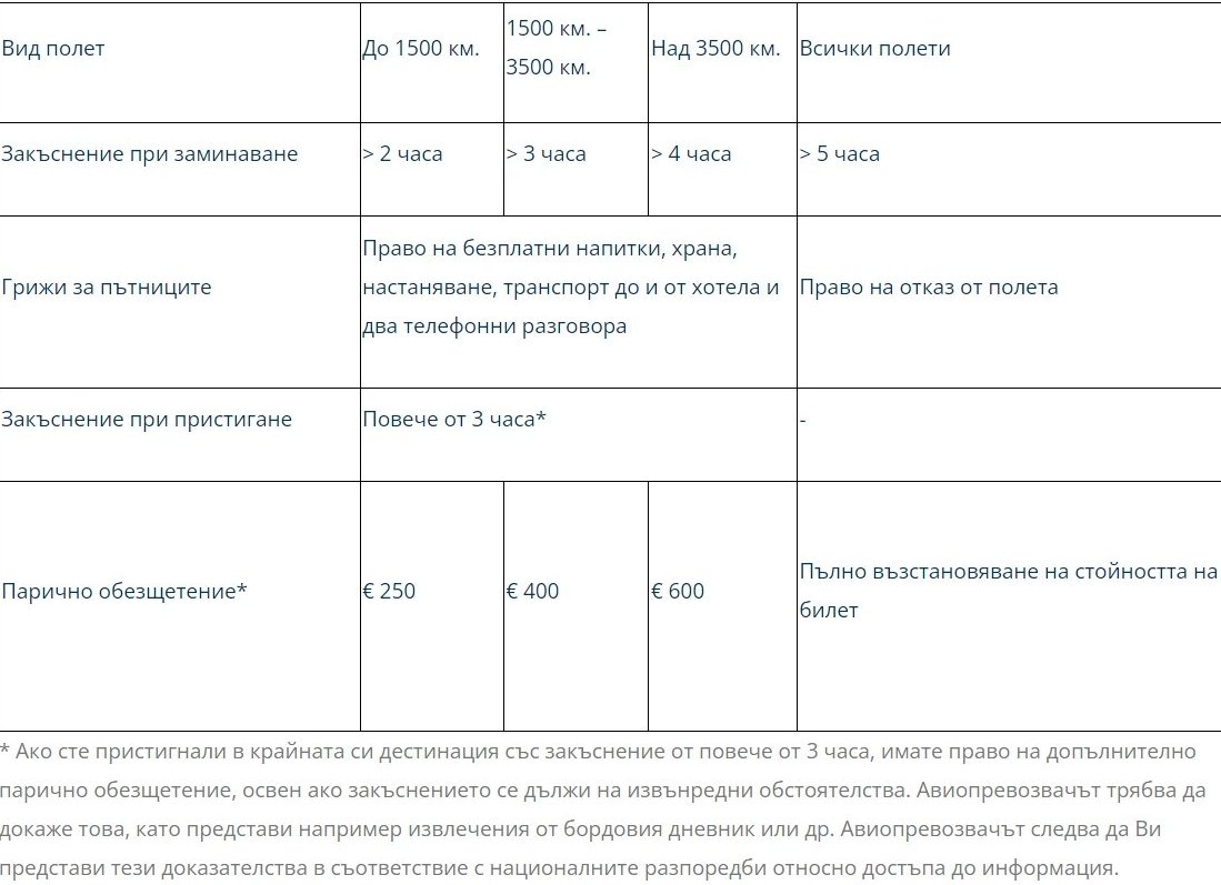 Обезщетенията са за закъснение над 3 часа при КАЦАНЕ, в зависимост от разстоянието на полета.