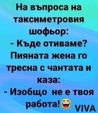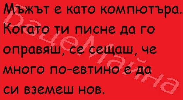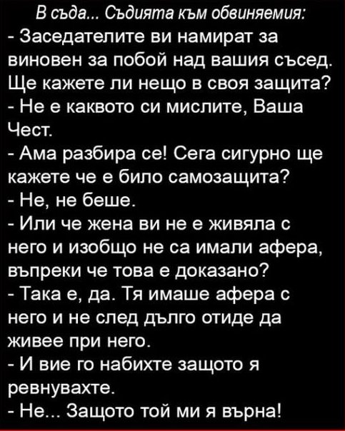 - Ще Ви обясня, господин съдия. Първата ми жена беше спортистка, постоянно викаше: "Темпо, темпо, по-бързо!". За това се разведох с нея. Втората беше лекарка, постоянно казваше: "На всеки 6 часа - по два пъти!". Третата беше зъболекарка, все викаше: "Няма да го вадим, има още време!". Четвъртата беше кондукторка, все казваше: "Влизай навътре, има още място!". Петата беше учителка, все викаше: "Не съм доволна, можеш още!". Шестата беше бензинджийка, все казваше "Вади маркуча и да си оправяме сметките!". Сега съм си намерил една - строителен инженер - с нея ми е най-добре. Тя вика: "Няма страшно, ако днес не стане, утре ще стане. Ако ти не свършиш работа, друг ще я свърши."