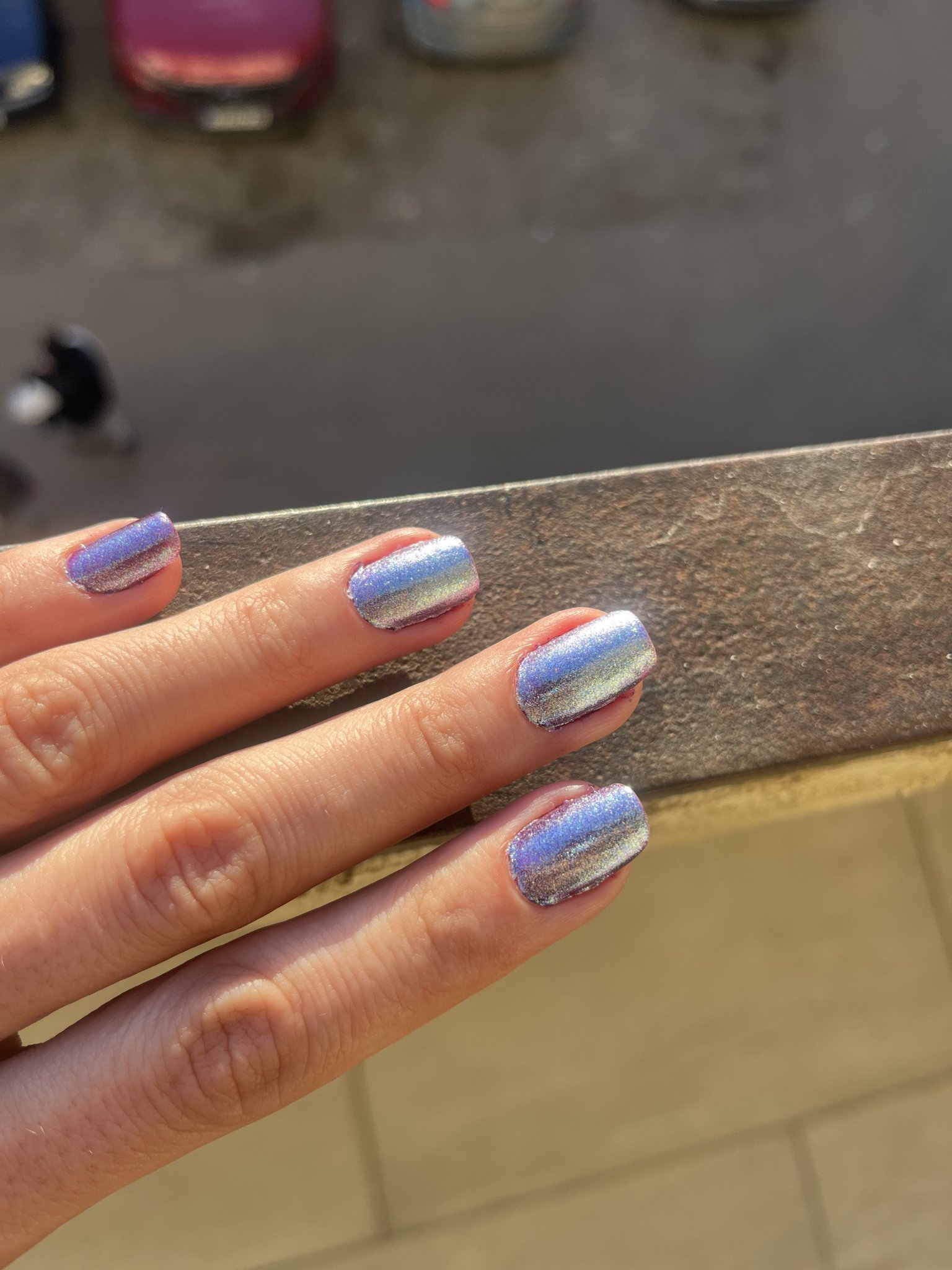Лилава основа на кико и essence metaglow top. Малко е гъст но много ми харесва и на живо е доста по ефектен. Отдалеч стои като огледален ефект лак