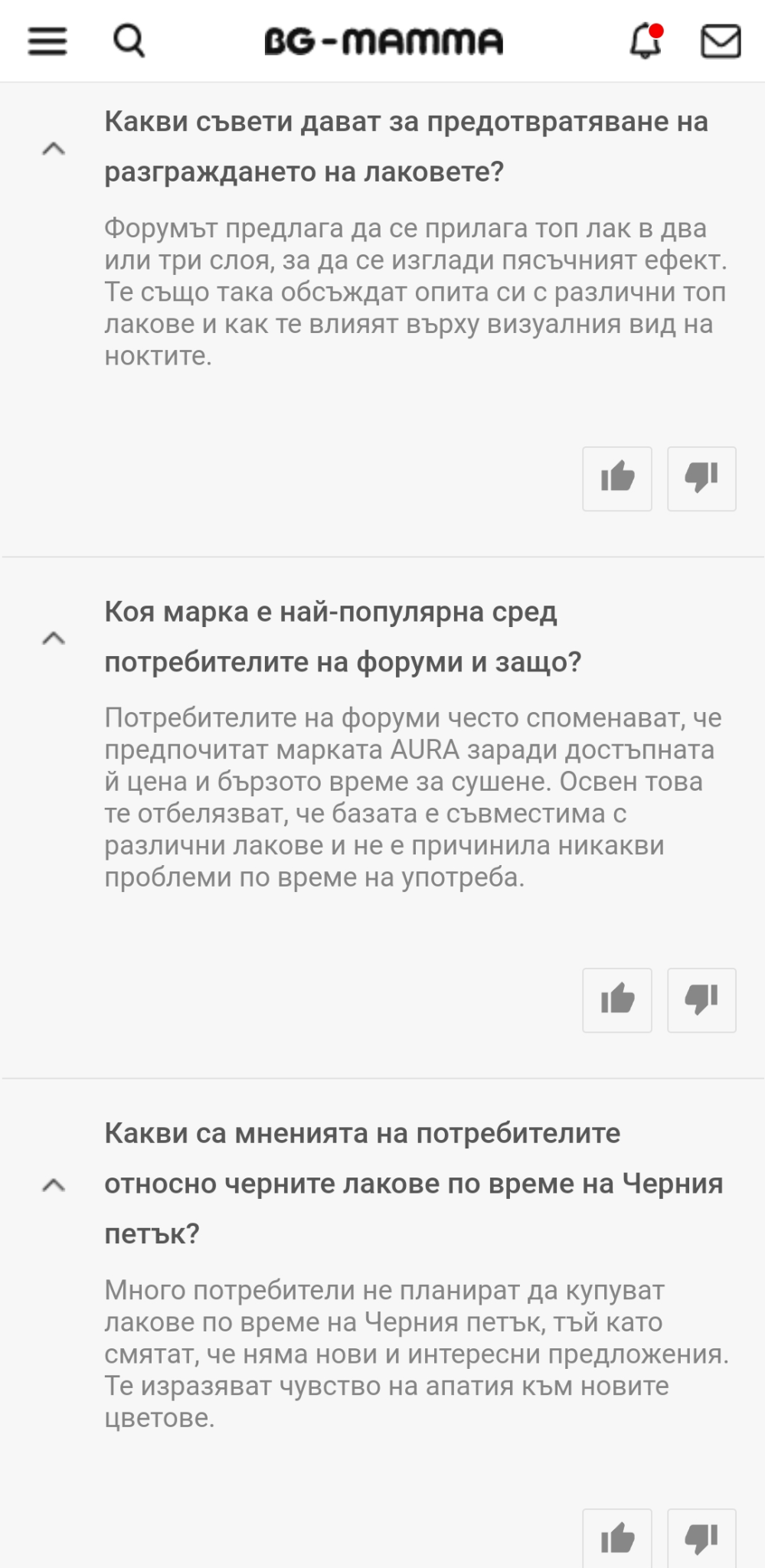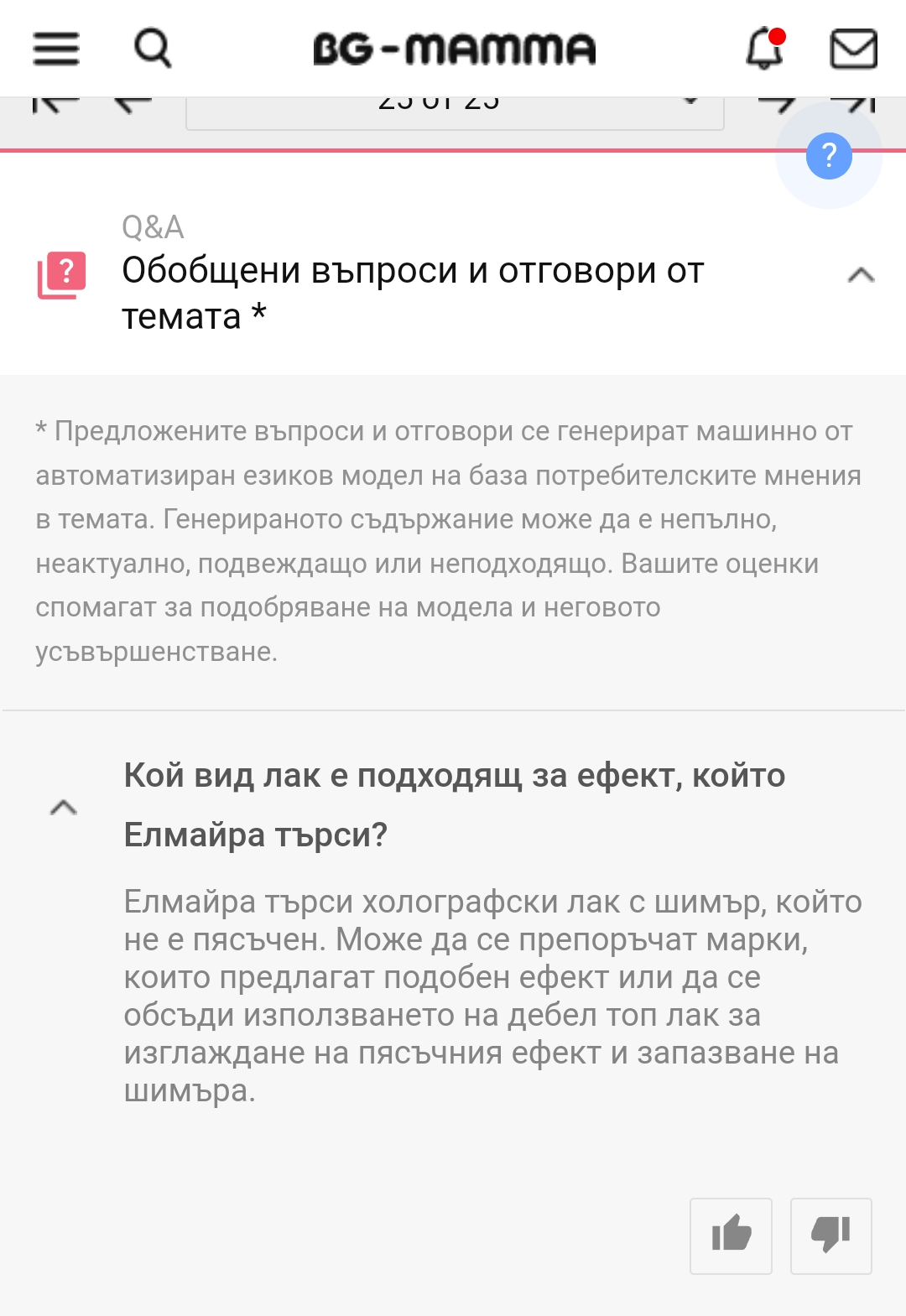 * Предложените въпроси и отговори се генерират машинно от автоматизиран езиков модел на база потребителските мнения в темата. Генерираното съдържание може да е непълно, неактуално, подвеждащо или неподходящо. Вашите оценки спомагат за подобряване на модела и неговото усъвършенстване.