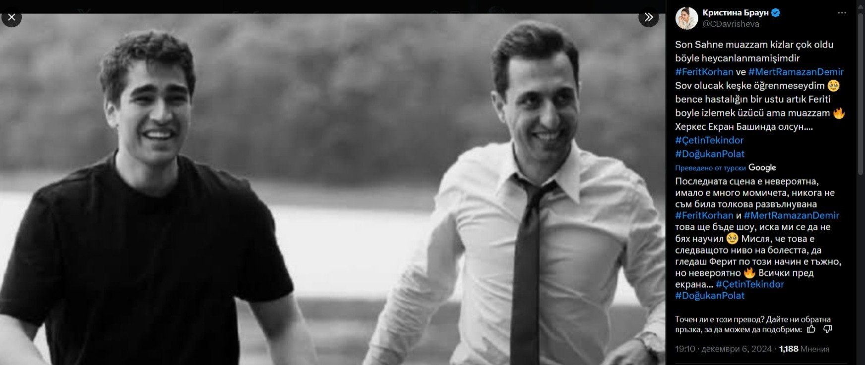 Кристина в Х вика ,че последната сцена била много добра не искала така да научава за болестта на Ферит. Въх чак се заинтригувах.