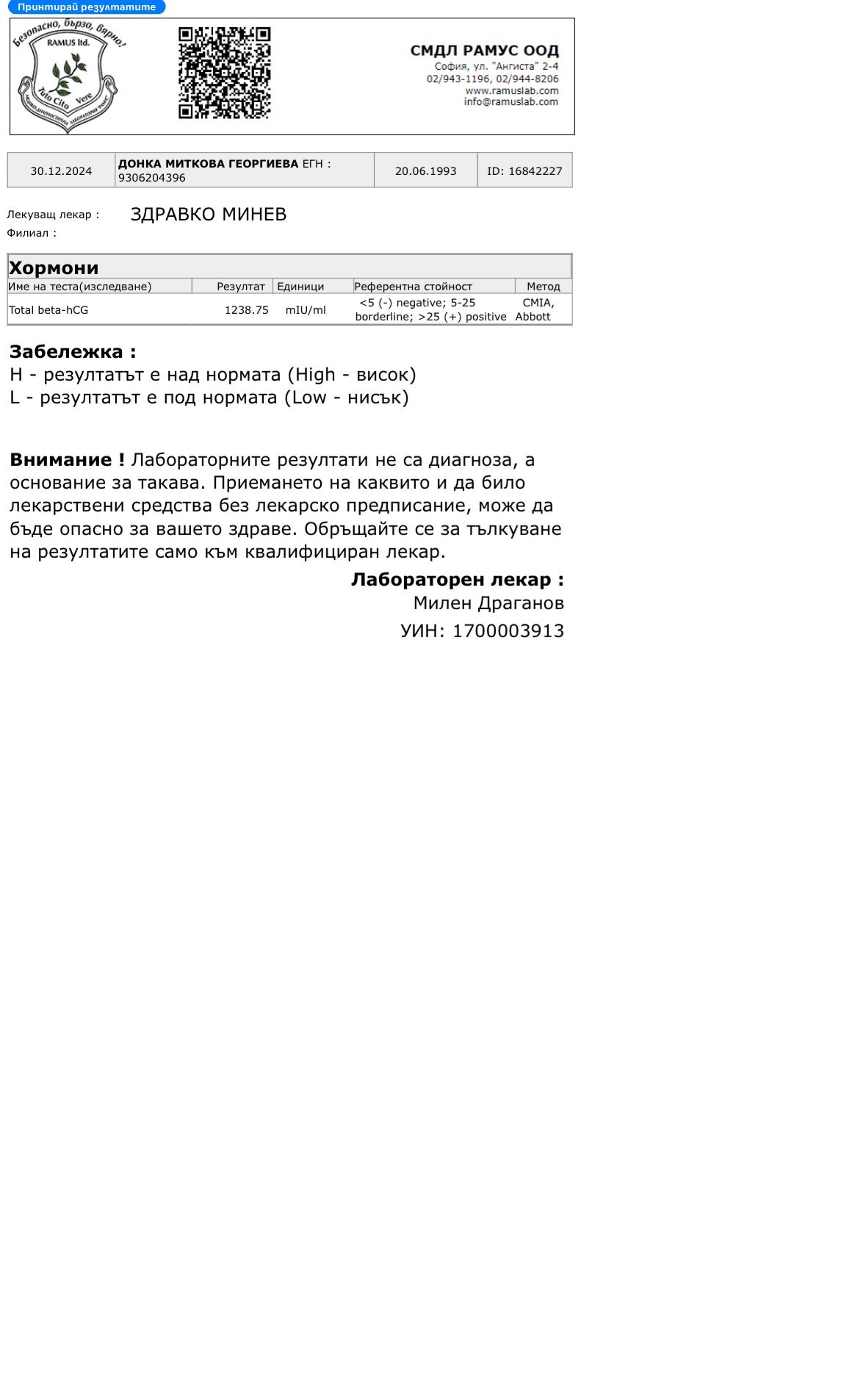 Здравейте Момичета радвам се да се включа и аз в темата !! На 17.12.24 имах върнати 2 енбриончета ,, днес си пуснах ЧХГ и ми излезе резултата някой може ли да ми каже дали това ЧХГ е добре за 13 ти ден