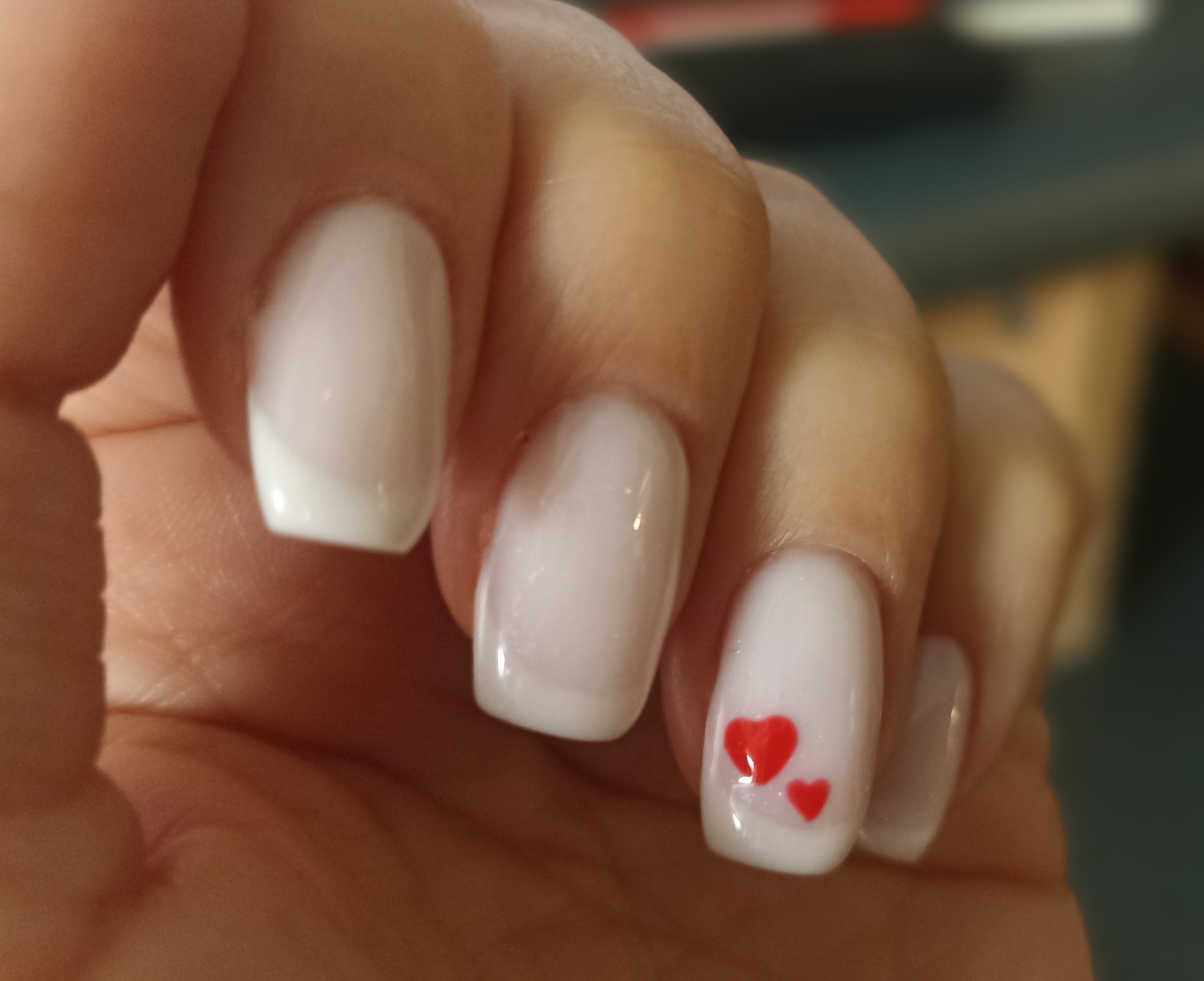 С два вида гел в бутилка е, като с единия съм изравнила, а другия е на тънък слой над бялото, защото е с розови частици. Така се изравни и неприятната разлика след нанасяне на бялото....