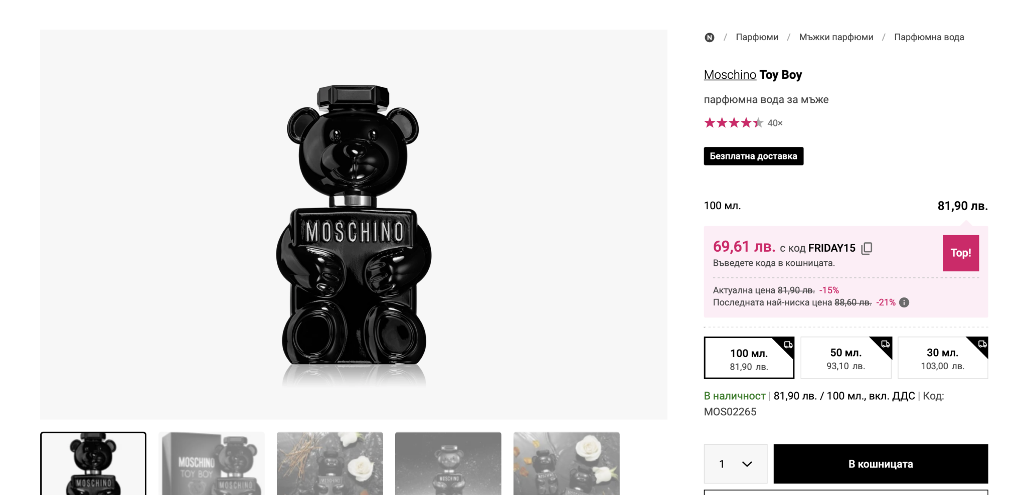 Някой по-рано спомена Toy Boy - в момента в Нотино цената за 100мл с кода е екстра. По-малките разфасовки са по-скъпи.
