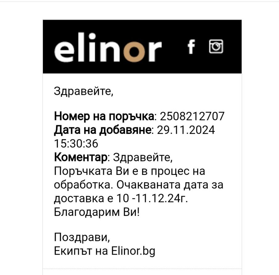 Аз поръчах от Елинор с взимане от магазин и не получих друг имейл, освен този за направената поръчка.След няколко дни се обадих да попитам и ми казаха, че поръчката отдавна е готова за взимане.