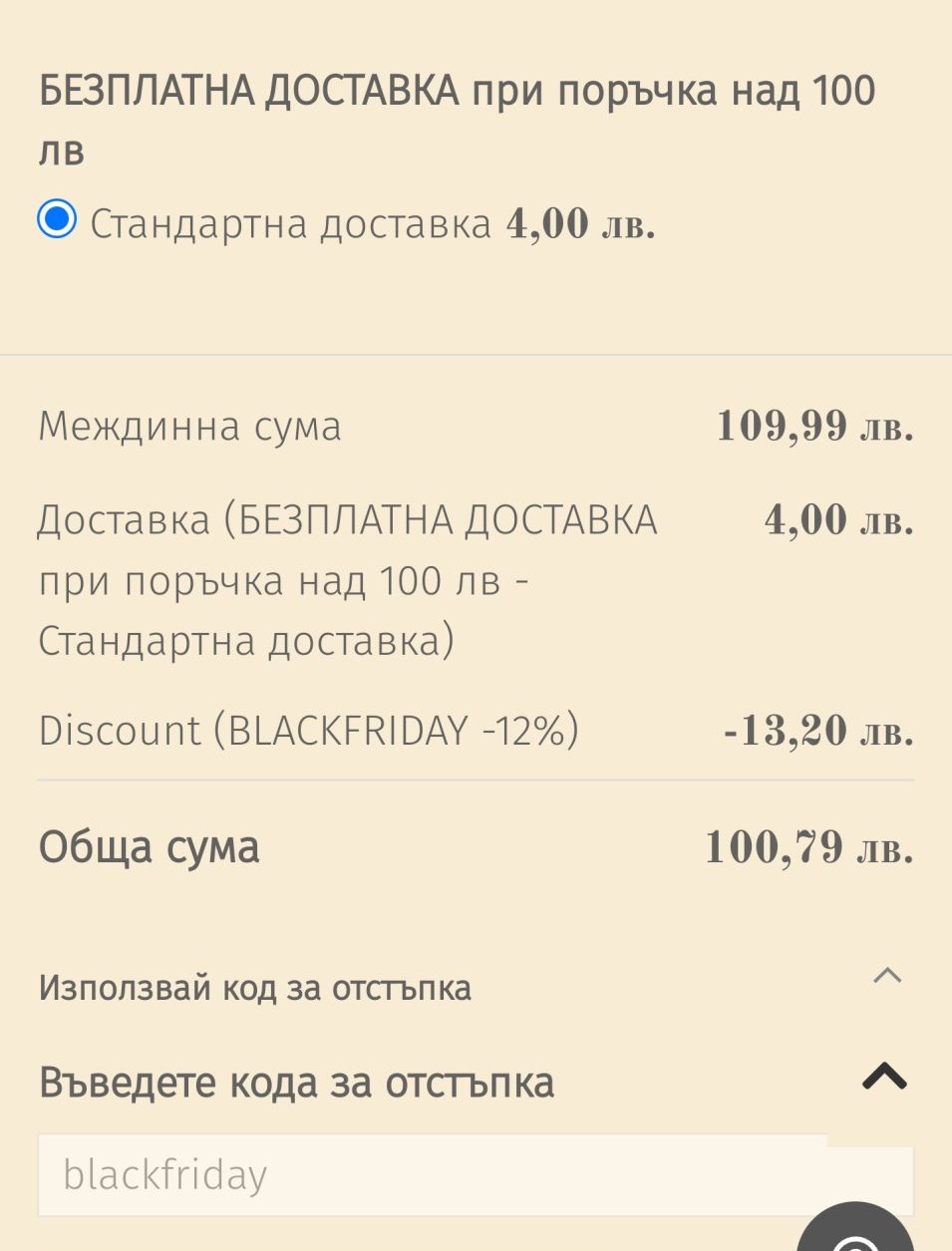 С кода пада под 100 лева, но само защото има 4 лева доставка е 100, 79 лева. Ако добавите още нещо да минете 100 лева, ще се хване на 96 лева реално.