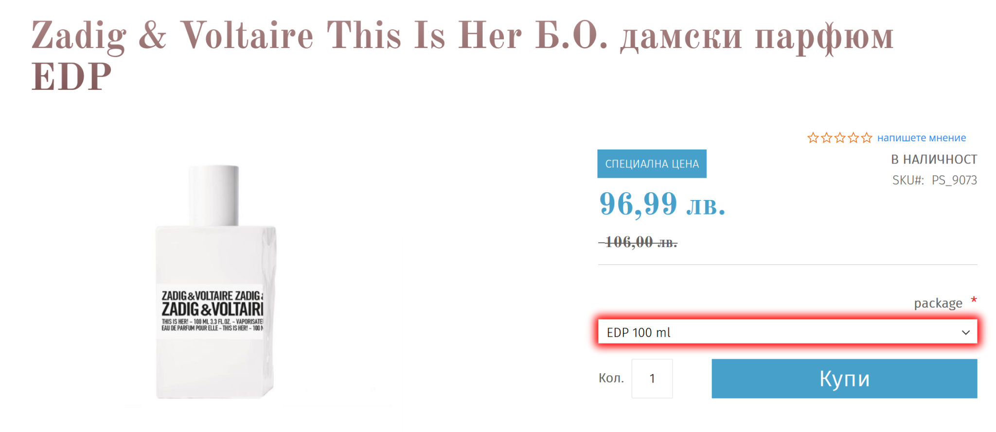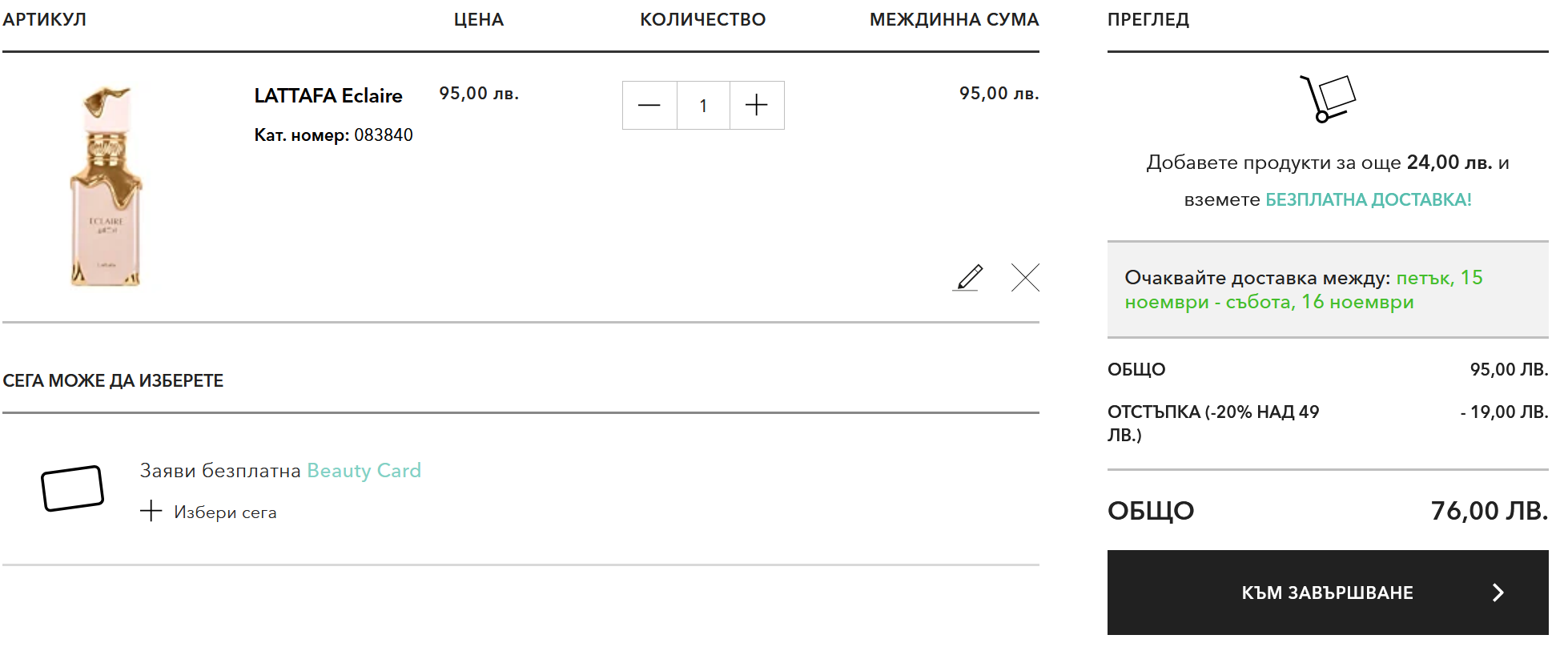 При покупка на парфюм от 100мл, получавате безплатно мини (спрей) от 8мл от новата колекция Les Ambres. На мен ми се падна Ambre Rubis (доволна съм). Плюс традиционните две мостри от каталога им по избор на клиента.
