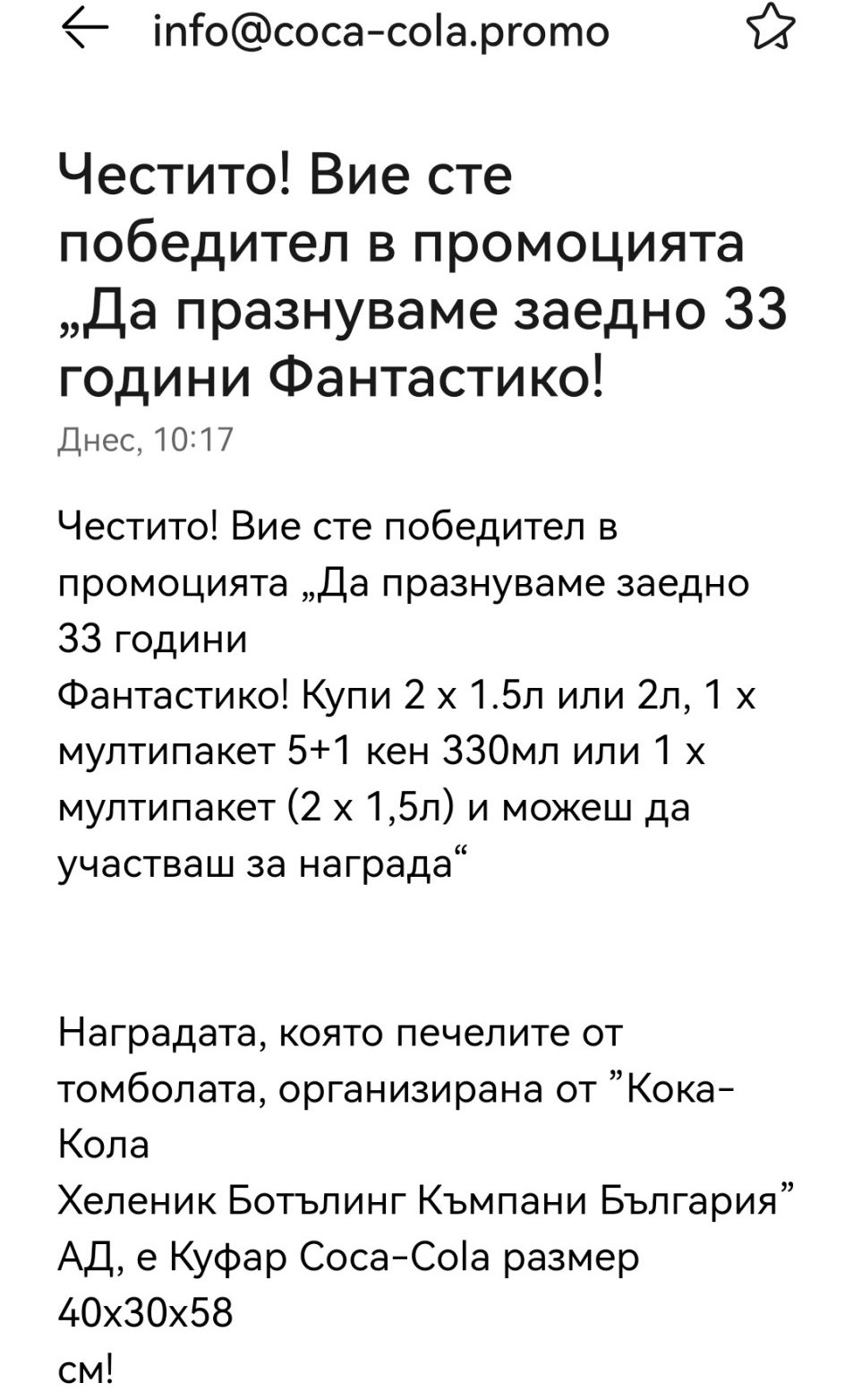 Честито! Вие сте победител в промоцията „Да празнуваме заедно 33 години Фантастико! Купи 2 х 1.5л или 2л, 1 х мултипакет 5+1 кен 330мл или 1 х мултипакет (2 х 1,5л) и можеш да участваш за награда“