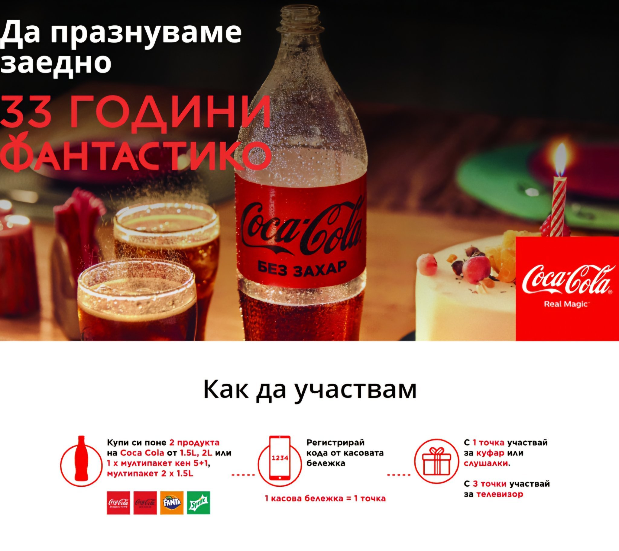Купи поне 2 продукта на "Coca-Cola" от 1.5L и 2L или 1 мултипак кен 5+1 , мултипак 2*1.5L от ТВ Фантастико,  регистрирай касовата бележка на сайта и участвай в томболата за: