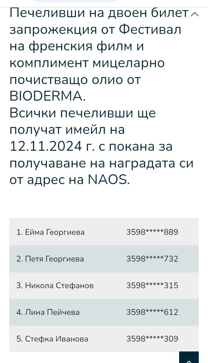В Наос/Биодерма има печеливши от играта с билети за филм- вижте си имейлите, ако сте участвали