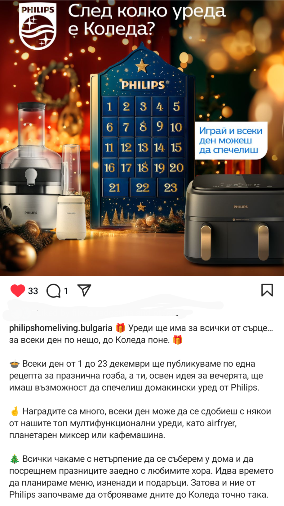 Philipshomeliving ще имат календар в инстаграм от 1 декември, ще раздават airfryer, кафемашина, планетарен миксер и други: