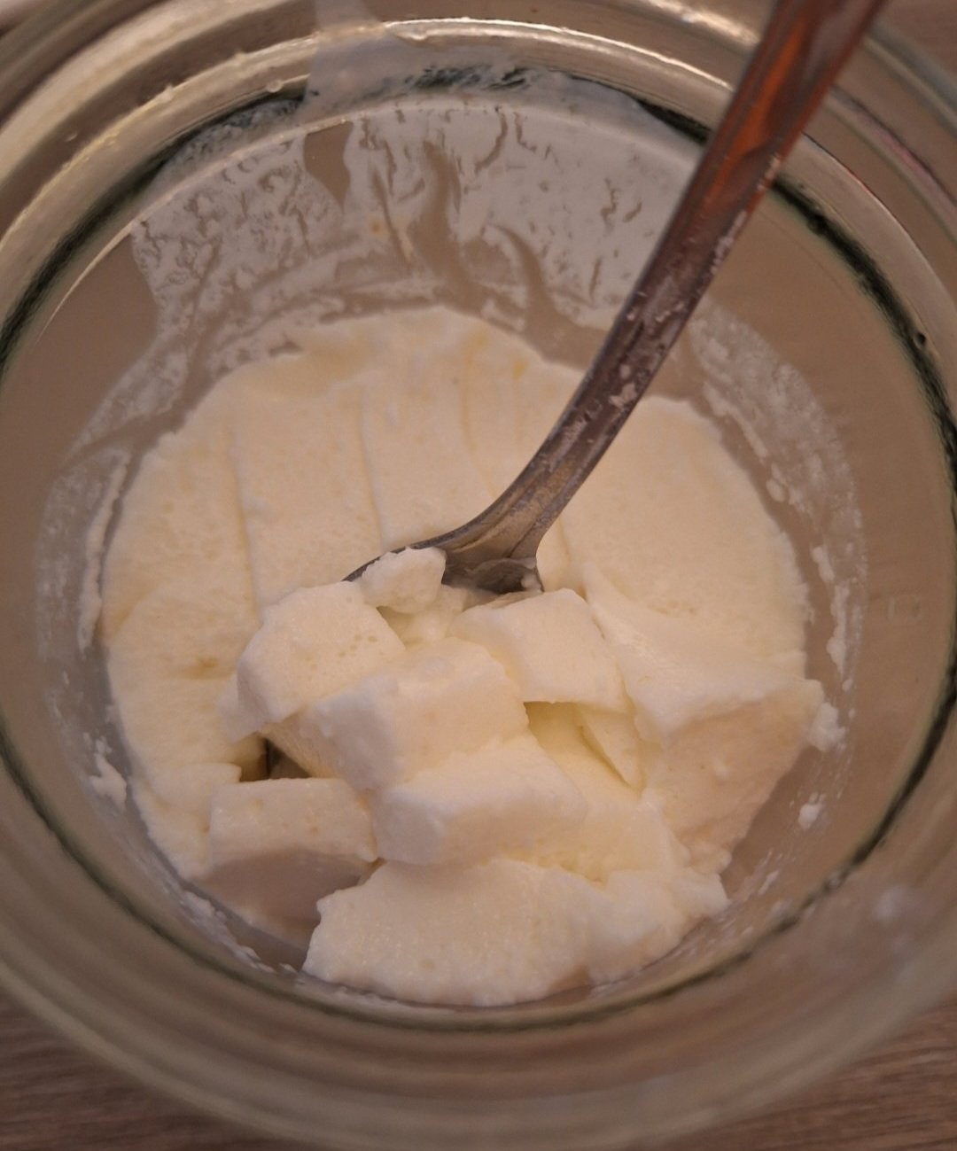 Исках само да го сгъстя, ама направо го желирах, та ще видя да го намачкам да не стои на цяло парче. Идеята ми е за нещо като Снежанка, та дори сол и чесън съм му сложила, не е за десерт това нещо. Ама... ето скуката до какво води