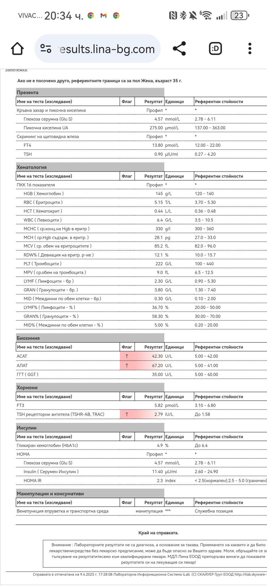 За инсулина висок е. Под 10 трябва да е, най-добре 5-6. Затова иска обременяване доктора. Вероятно да лъсне ИР. Гликирания и захарта са ок, но инсулина не е. С движение и хранене може и да можеш да повлияеш, но това не мога да предвидя. В "Зоната" много хора си помагат с хранене за тия неща. Аз също си помагах преди и изследванията го потвърдиха, че Зоната действа. При мен лъсна проблем със захарта още при натоварване и профил, та не стигнах да пускам инсулин. Тогава доктор не ми беше искал и не знаех. Но така и така ми изписаха антидиабетни и нямаше смисъл да гледам инсулина. Едно и също се пие като лекарства. Първо бях на ВМХ хранене и макар да изкарах 3 г, като 1.5 г бях по-стриктна и още 1.5 с поддържане с повече въглехидрати, този режим не ми беше Ок за жлезата. След години пробвах Зоната. Идеален и за жлезата и за инсулина и захарта.