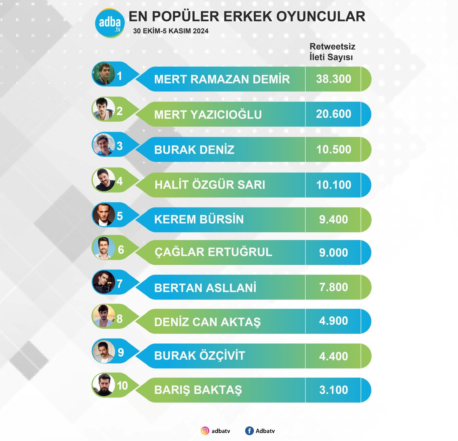 Адба обяви кои са най-популярните мъжки актьори на екрана! (30 октомври-5 ноември).Керем тази седмица е на 5-та позиция.