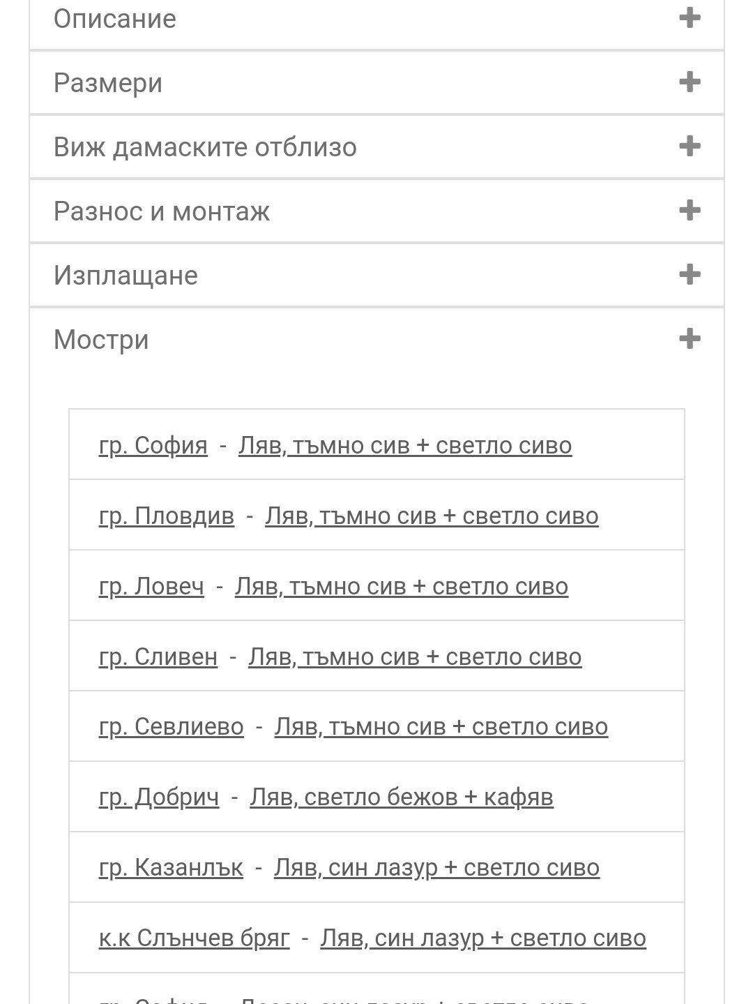 MarieSt , уж търсих инфо,но чак сега го намерих най-отдолу за картата. Иначе аз за мостри разбирам ,че нещо е сглобено и изложено да се види,а не че е налично,но нз.Както и да е,леглото ,което аз гледам няма написано къде има мостри Simple Smile