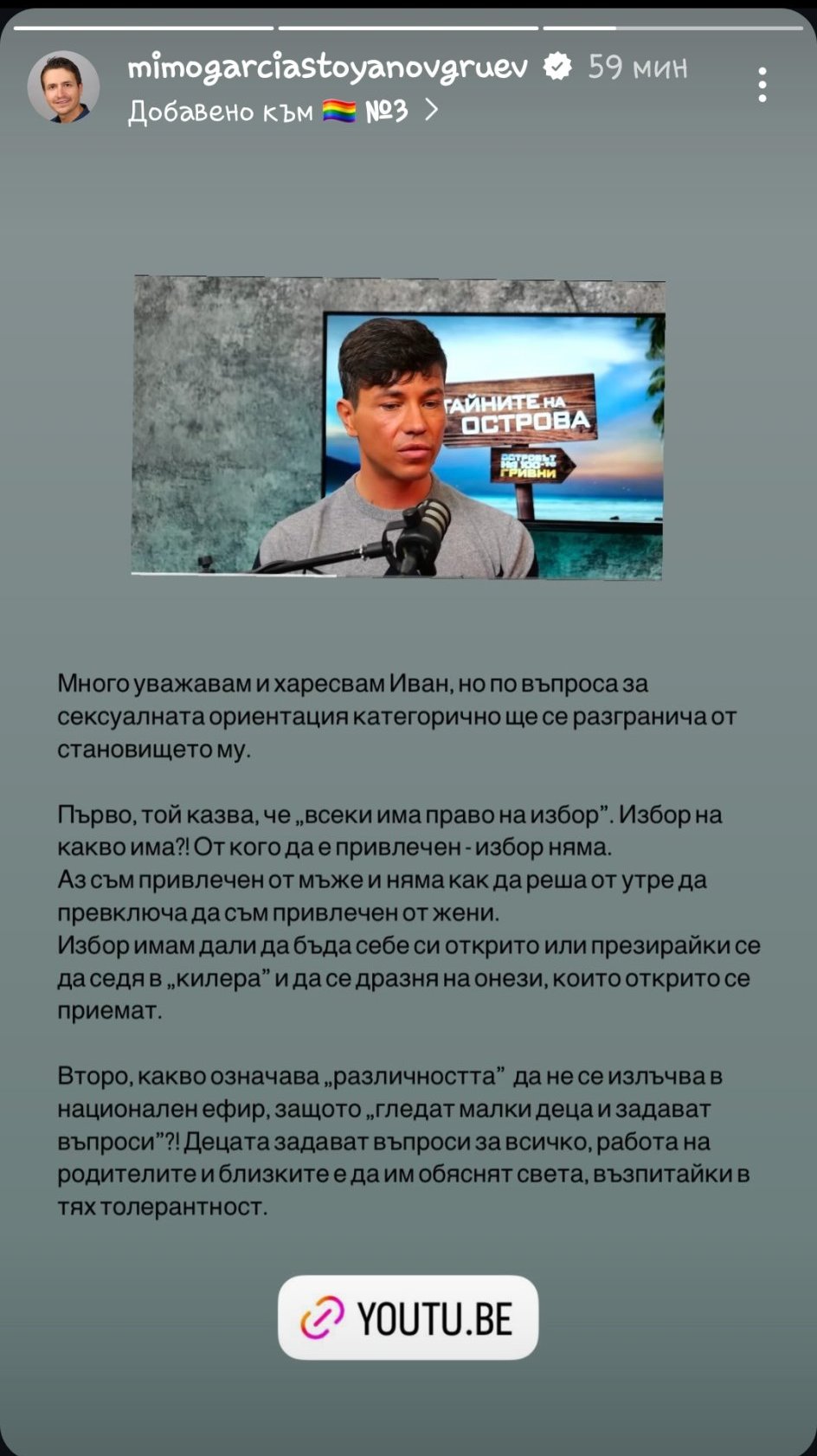 Иван така е преценил, неговата кауза не е да афишира какво и кого харесва. Много е тъпо Мимо да го напада. Мимо да си преследва собствените виждания и цели. Казвам го като подкрепяща ЛГБТ+ хората.