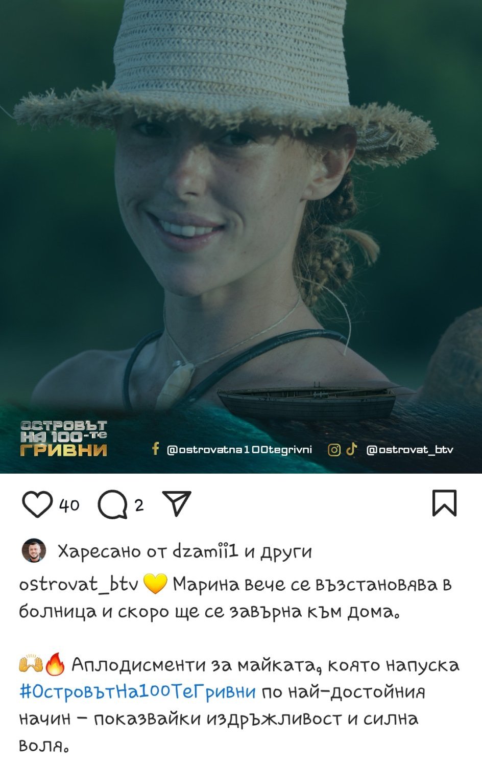 Показаха Марина в болницата. Тя пак рева. Петя каза, че ако Марина е била отпаднала, тя е щяла да си даде гривната и да я спаси. Стига бе, Марина иска всеки да я спасява. То не бе Тренера, то не бе Петя! Добре че се избяга от тази опция и не се наложи да я спасяват.