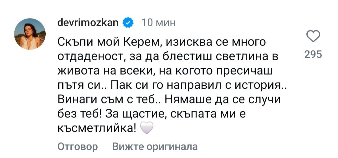 Смятам, че след като Керем призна, че е влюбен, това означава, че и двамата са сигурни в сериозността на чувствата си и са готови да се покажат. Кога обаче само те си знаят. А дали е Мелиса ами вече 2 седмици се върти нейното име и никой не е опровергал, значи е тя. Но този път и аз мисля, че Керем ще си живее тихо и спокойно любовта далеч от хорските очи 🧿🧿🧿 Все пак има горчив опит от това всичко да е напоказ.