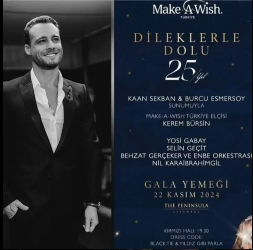 "Make-A-Wish Turkey ще отпразнува 25-годишнината си, като този път даде желания за деца, които се борят със сложни заболявания. С участието на неговите посланици, актьорите Алина Боз и Керем Бюрсин. Галата ще се проведе на 22/11 в Истанбул."