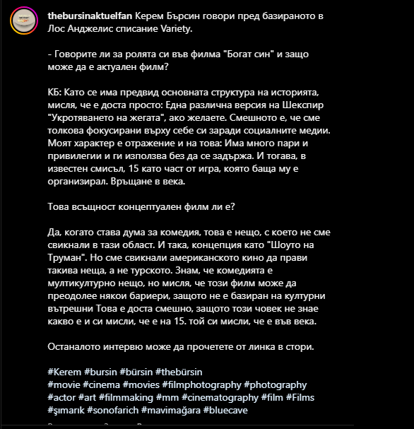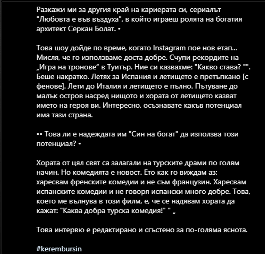 "Говорихме за всичко с Керем Бюрсин. Разговаряхме с актьора по много теми като процеса на писане на филма, тактиките на флирта и какво е любовта."