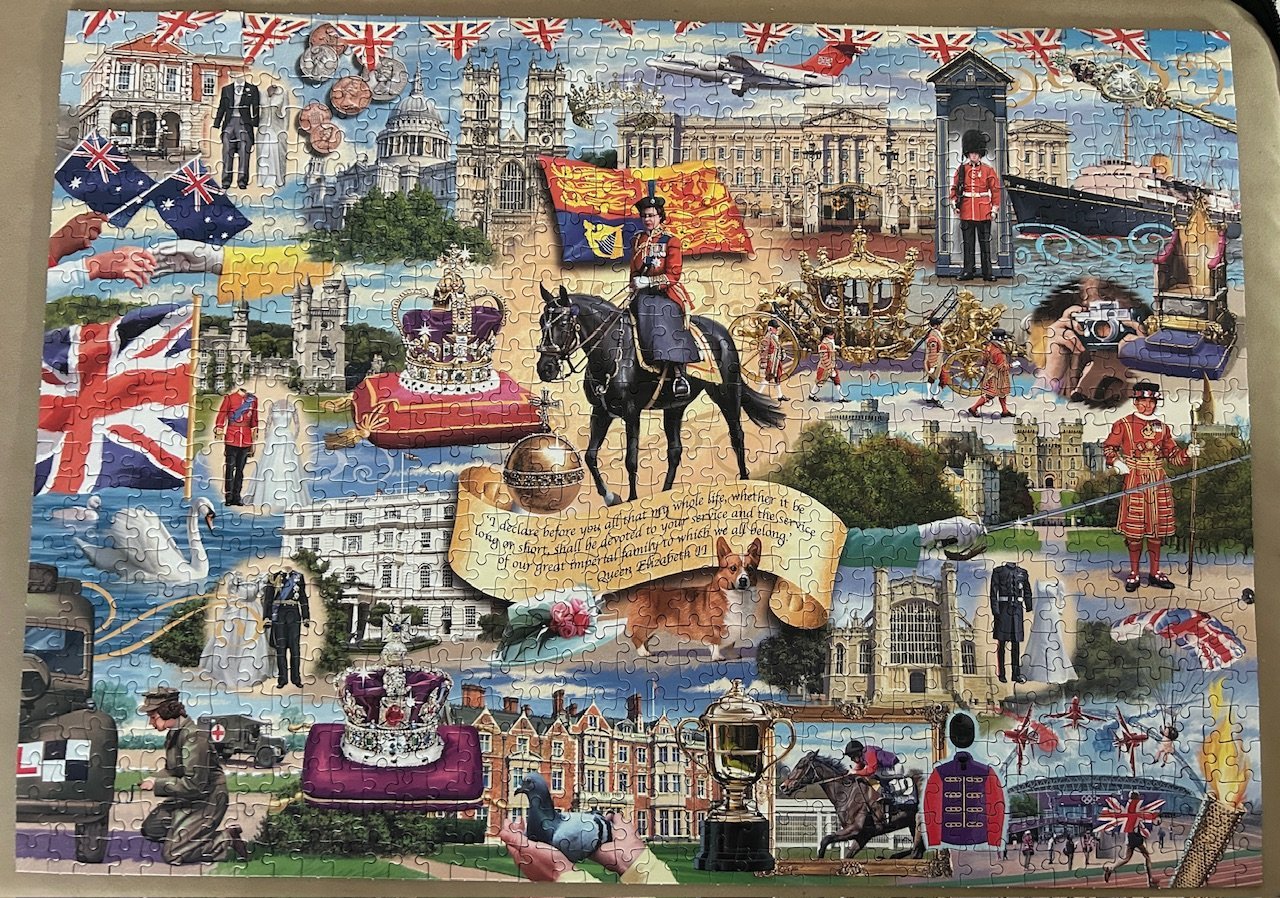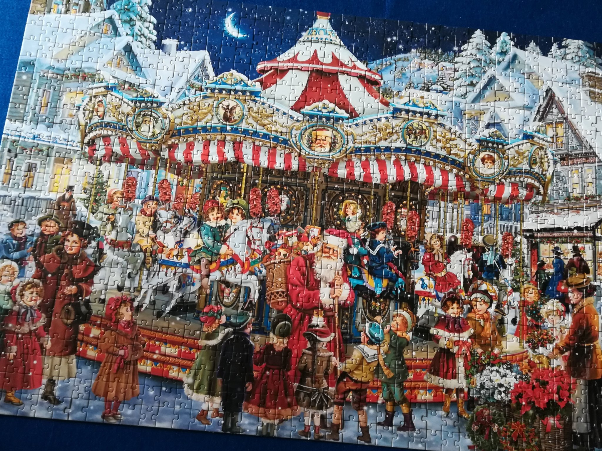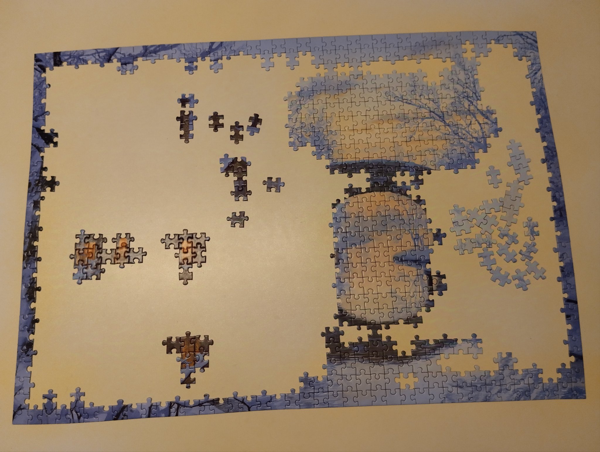 Да покажа как върви при мен големият пъзел - трудничко, но по-бързо от очакванията ми (снимката е малко кофти, заради лампата на плота):