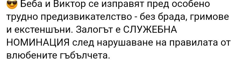 Определено има тенденциозно отношение от ББ, ето как сега се опитва да покаже Ванеса в добра светлина, а пропусна поне 10 момента на лоша светлина... Няма да я забравя как се глезеше "Биг брадър, може ли една баничка с айрянче... И сладоледче, ванилово", но това удобно го пропуснаха и я изкараха, че едва ли не се е опълчила на ББ и не е изпълнила мисията 😁