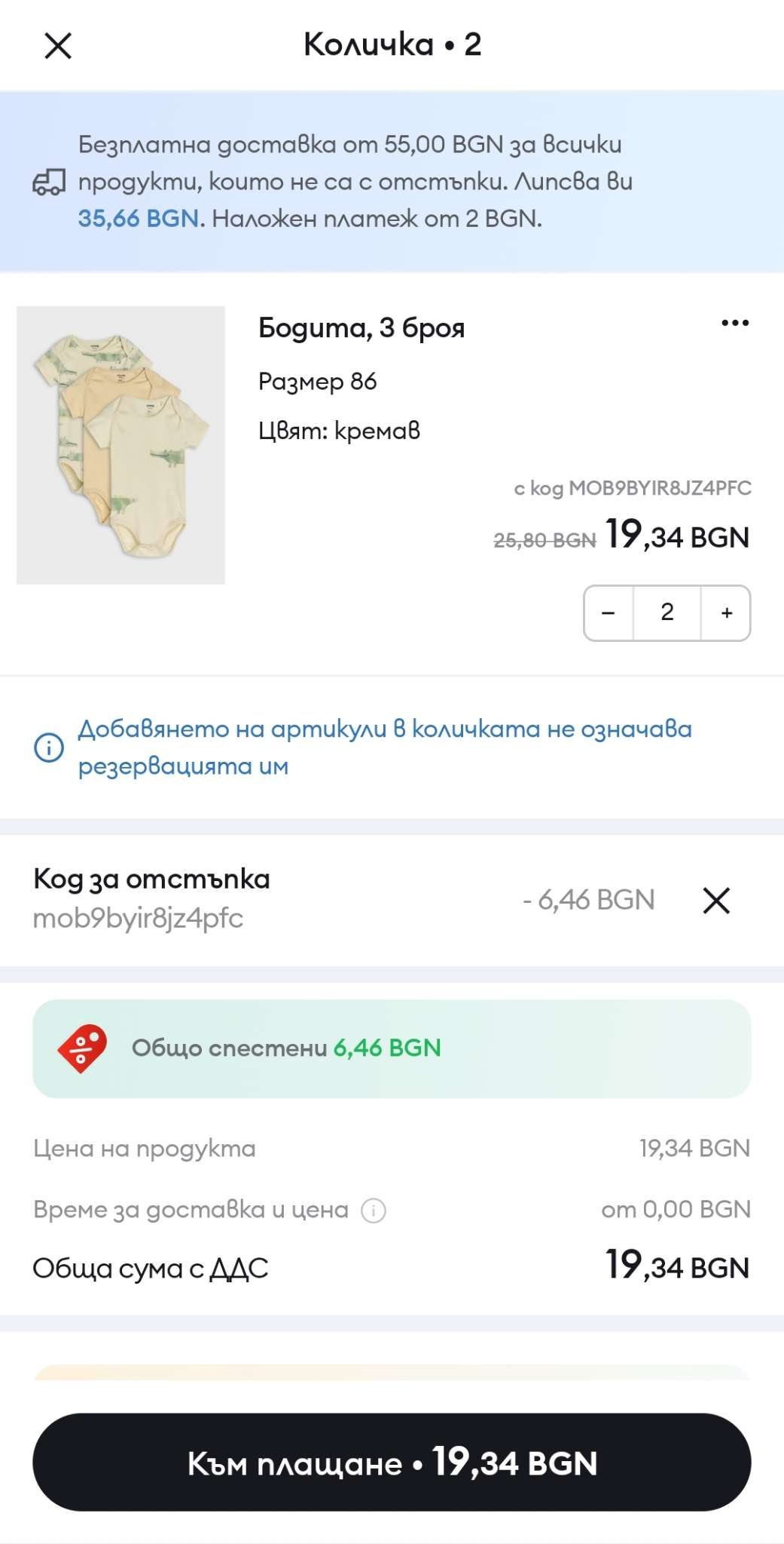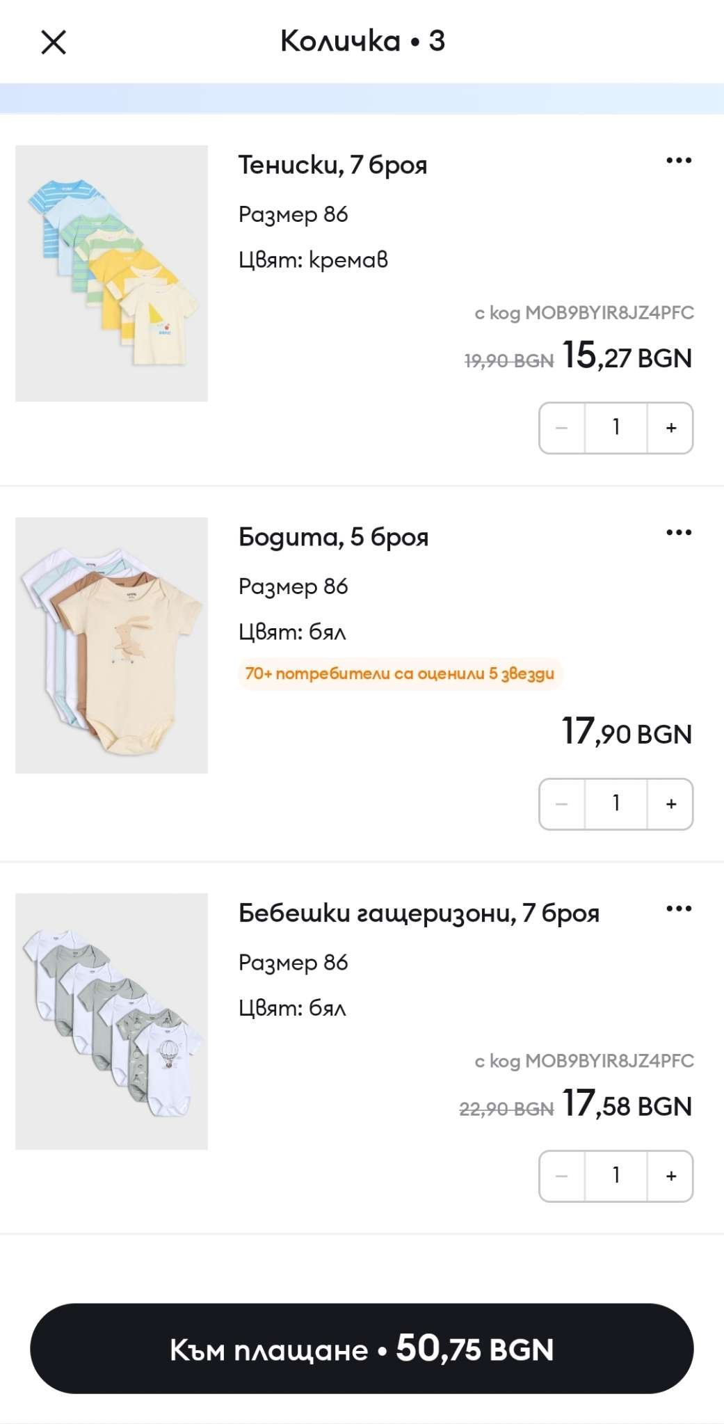 Ако в кошницата има два пъти артикул, който отговаря на условията (каквито и да са те), също се намаля. Също и бебешките бодита в мултипакет се включват в намалението, друг е въпросът защо някои се намалят, някои не. Секцията с бебешки дрехи се води Дете 0-2.
