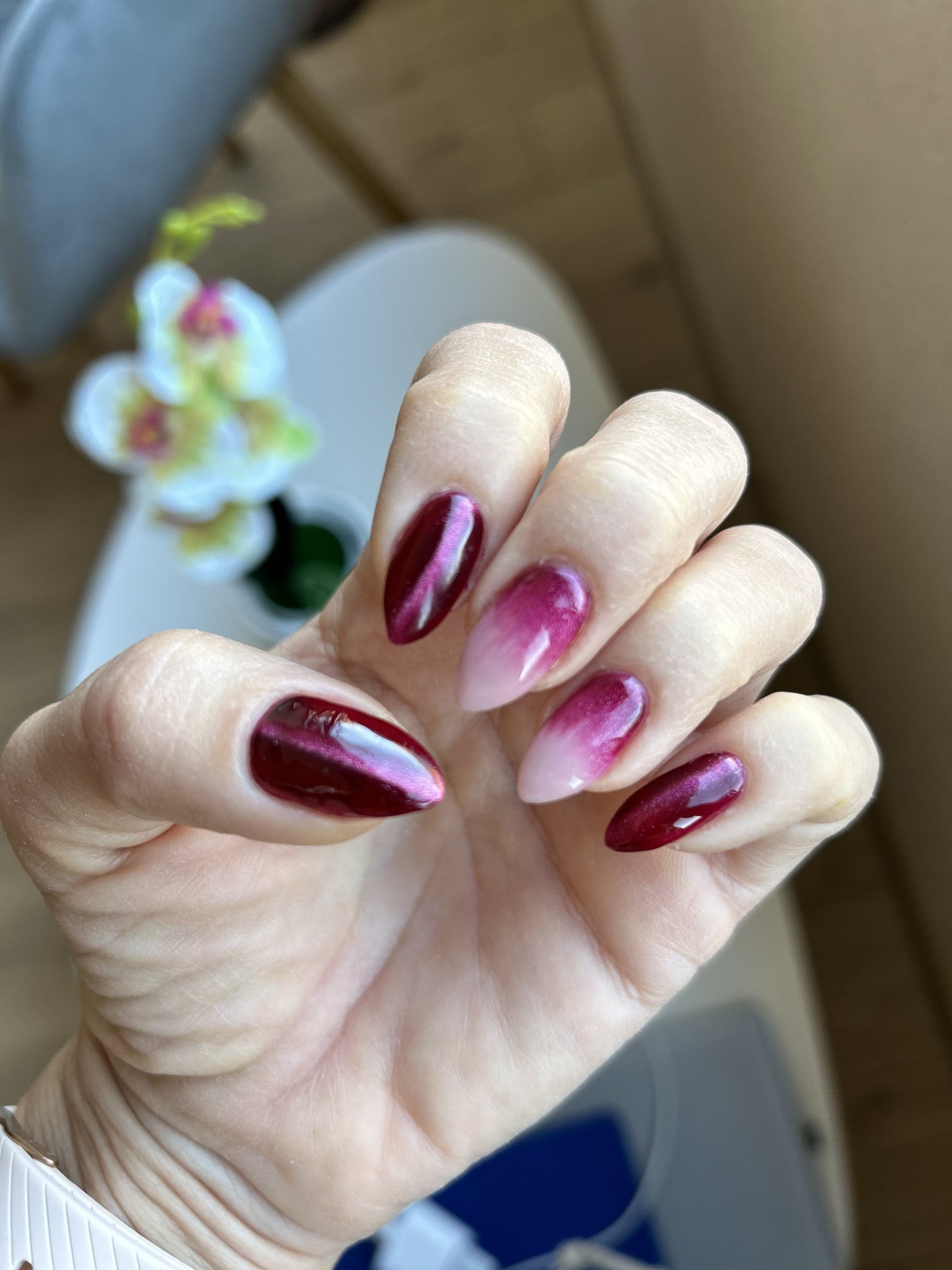 Ето го моят. Историята му е много интересна. Спря тока на половината процедура. Сменихме си концепцията и го направихме с ефект котешко око.  Момичето довърши работата си брилянтно и то -на светлинната на фенерчето от телефона си и заредена лампа за печене. Така е в дълбоката провинция! Токът винаги може да те сюрпризира неприятно там!