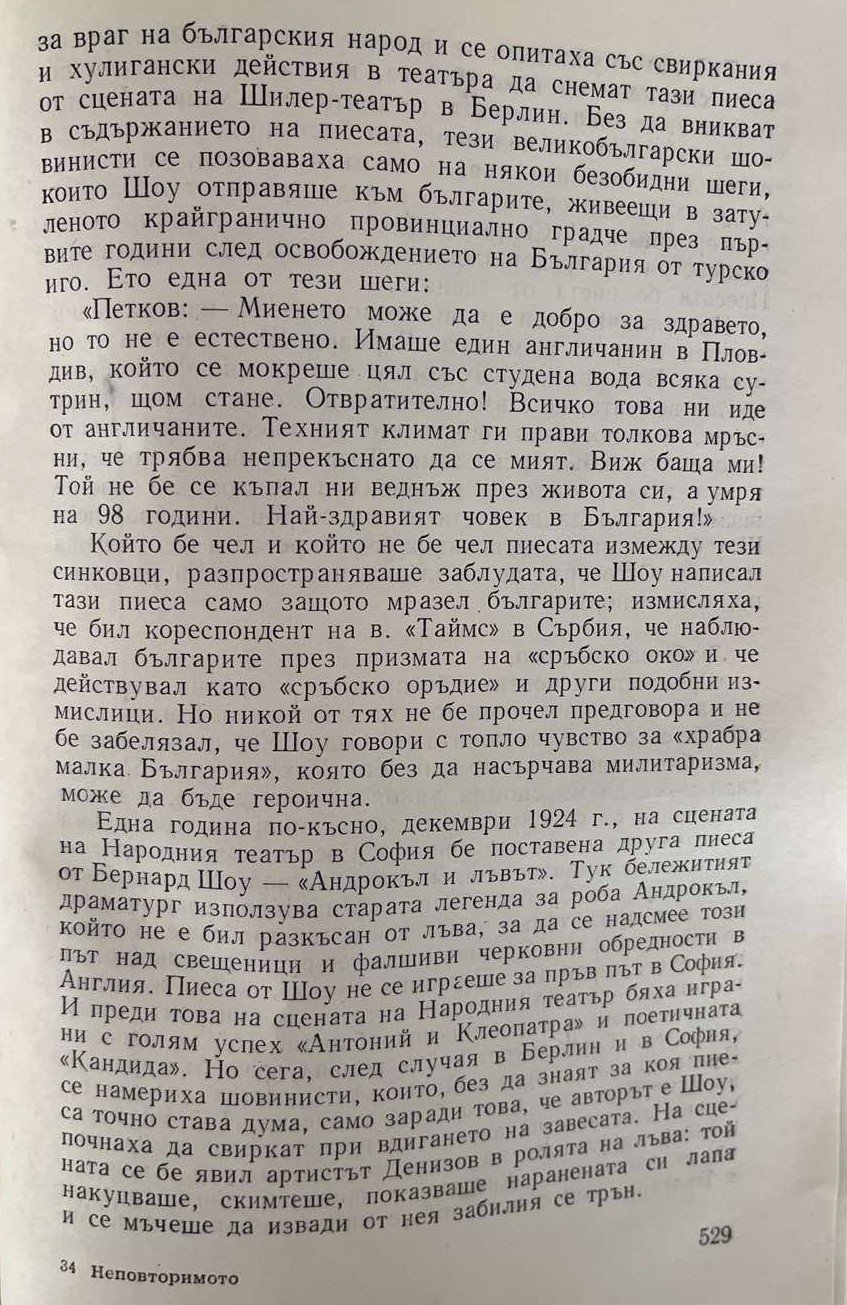 През декември 1924 г. на сцената на Народния театър в София бе поставена друга пиеса на Бърнард Шоу – „Андрокъл и лъвът“. Тук бележитият драматург използва старата легенда за роба Андрокъл, който не е бил разкъсан от лъва, за да се надсмее този път над свещеници и фалшиви черковни обредности в Англия. Пиеса от Шоу не се играеше за пръв път в София. И преди това на сцената на Народния театър бяха играни с голям успех „Антоний и Клеопатра“ и поетичната „Кандида“. Но сега, след случая в Берлин, и в София се намериха шовинисти, които, без да знаят за коя пиеса точно става дума, само заради това, че авторът е Шоу, почнаха да свиркат при вдигането на завесата. На сцената се бе явил артистът Денизов в ролята на лъва: той накуцваше, скимтеше, показваше наранената си лапа и се мъчеше да извади от нея забилия се трън.