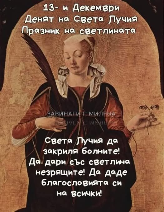 За днешния ден: " На 13- ти Декември се почита Света Лучия. Според Юлианския календар това е най- късият ден и най- дългата нощ в годината. Заради това има поверие, че Света Лучия прехвърля дните и носи светлина. Светицата е покровителка на зрението и на хората страдащи от очни болести".