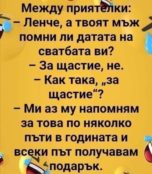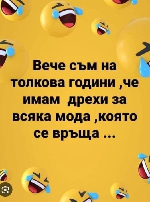 И една смешка. Преди да започна да ви пиша реших да мина през банята и да си изпера бельото. Тук бельо, там бельо - суКиена ( както казваше сина ми) на лице, ама гащи - нет. Тук гащи, там гащи няма и няма, докато най-после се усетих, че те са си все още на мен. така съм си търсила и очилата, а те - на главата ми. Една пациентка сподели, че така една сутрин си търсила зъбите, а те били в устата й. Комплименти за мен - толкова са й били удобни, че даже не ги усеща!!! Ти да видиш.
