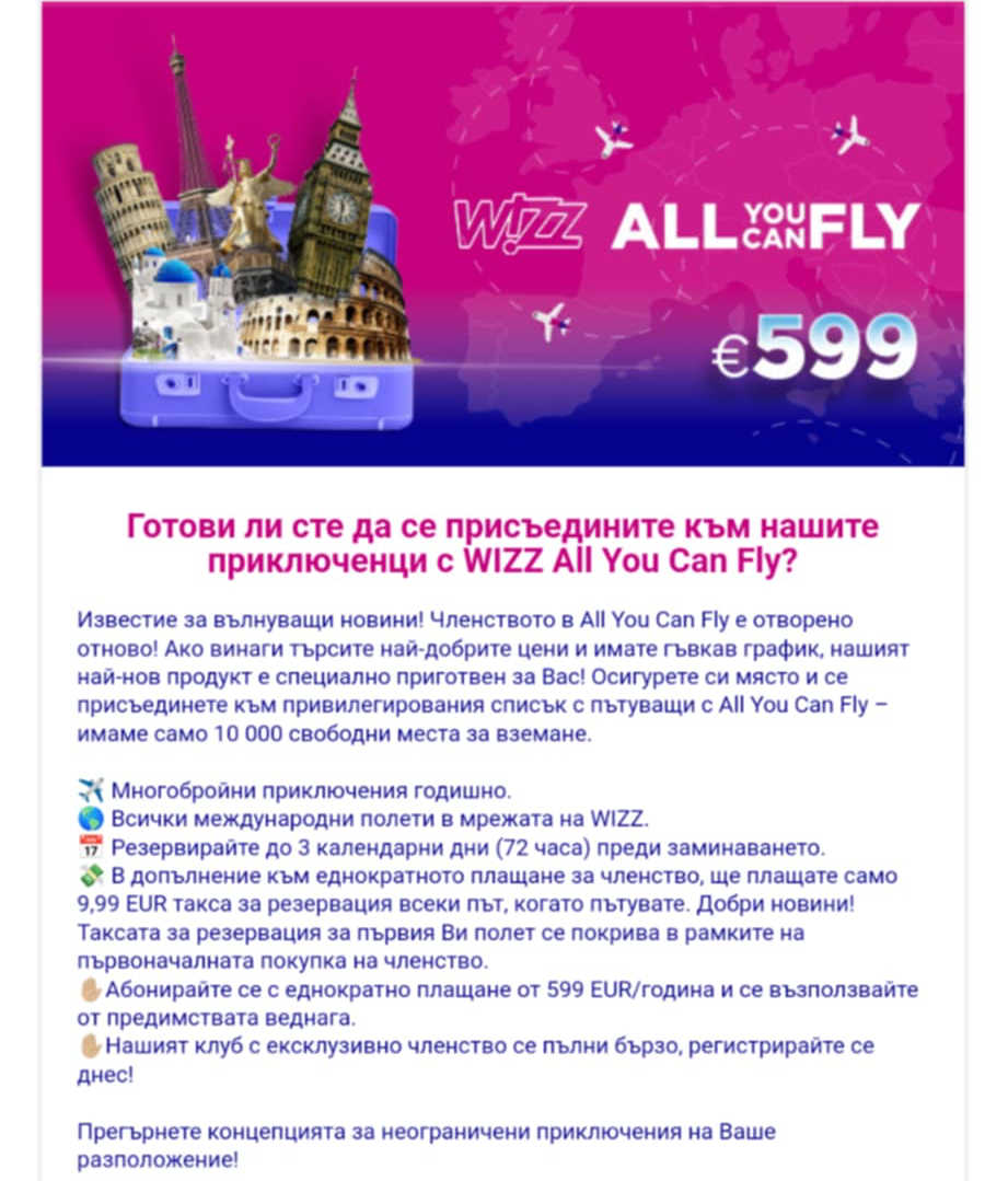 Аз, дето пътувам поне веднъж месечно с тази авиокомпания (изключвам другите) все намирам билети по 10 и 20 евро и подобна оферта от 599 евро на година не да мога да я избия, дори и безплатни да са ми полетите, а те по 9.90 евро на посока. И реално, като пътуваш повече, даваш още повече пари. За да избиеш 600 евро, си дал още няколко стотин и ето ги 1000 евро, мерси.