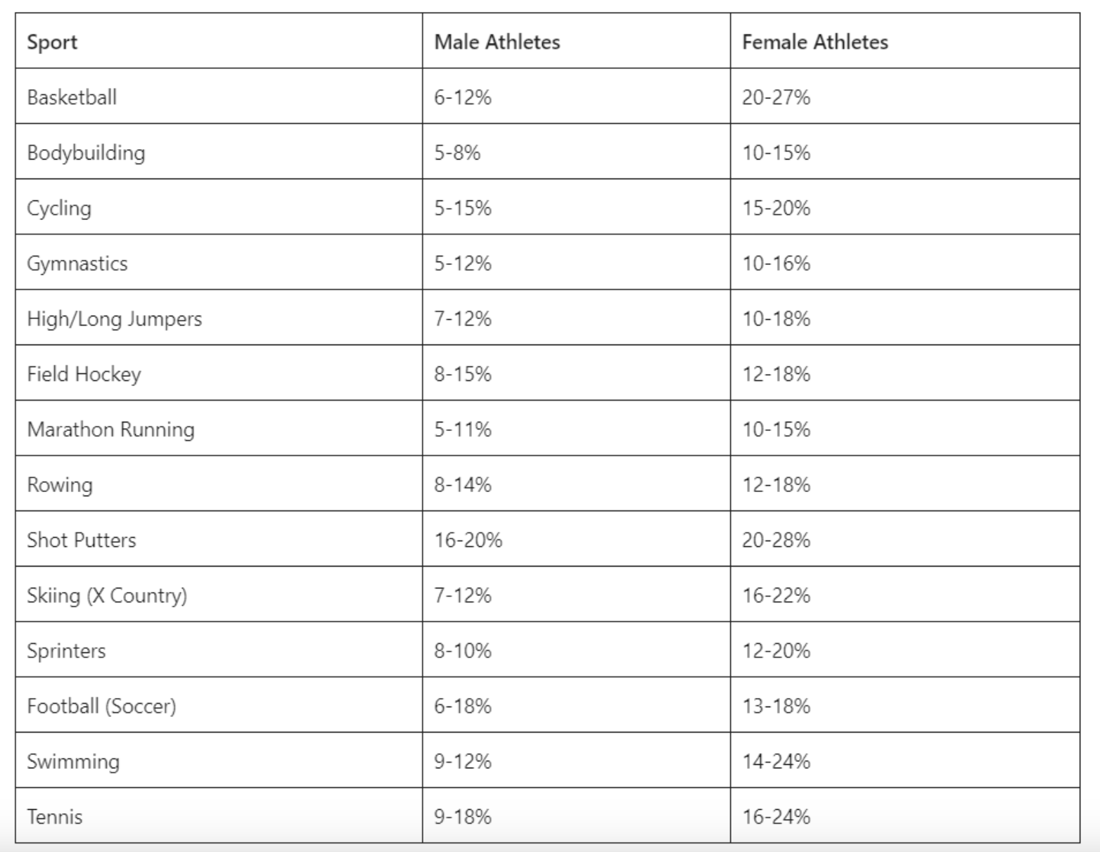 Забележете колко ниски са процентите при гимнастиката и боди билдинга, но това предполагам се дължи на доминиращия процент мускулна маса при тях.