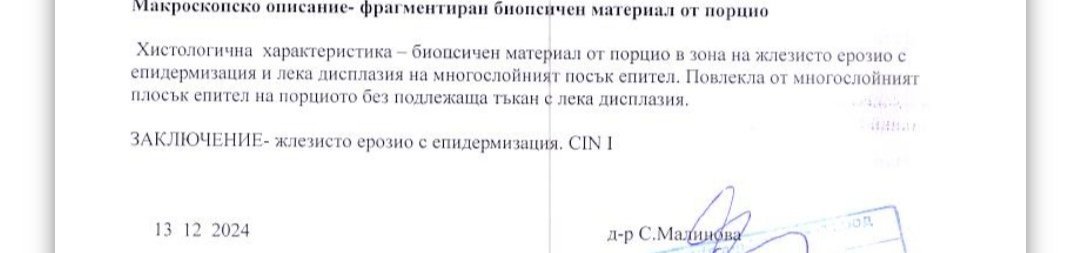 Здравейте, момичета. След доста четене и търсене пиша и тук. След много леко прокървяване след секс октомври края, отидох на преглед. Преди това проблеми сериозни никога не съм имала. Лекувала съм два пъти бактерия през годините. Прегледа мина с цитонамаска, колоскоп (лекарката видя малък участък, който не се оцвети), пуснахме и тест за HPV. Разбрахме се след резултатите от всичко да отида за биопсия.  Резултатите са следните : от микробиологията - енерококус фекалис 10 0000, HPV - 59, a от биопсията , която последствие правихме CIN 1 /ще приложа изследването/. Започнахме лечение на бактерията 2 пъти по 6 Полижинакса (преди и след цикъл). За HPV ми каза нищо да не пия, което много ме учуди - този се води от рисковите. Имам много близък човек с HPV и на своя глава започнах изопринозин по 1 таблетка на ден. И сега голямото ми объркване идва от подхода към резултата от биопсията. Първият път като се чухме с лекарката ми каза нищо няма, всичко е наред, нищо няма да правиш, звънни ми след НГ. Обадих и се след НГ препрочето и изследванията отново,  каза ми,че няма страшно, че ще го изгорим, но на първия ден от цикъла ми пак да и звънна. Съответно - звъня онзи ден, зпаиса ми час за преглед, но нито дума за изгряне. Много съм объркана, някой с подобни резултати да сподели по какъв път е минал. Доколкото се информирах подобен резултат от биопсията може да се лекува и консервантивно. Удачно ли е преди горене да се подходи така? Иска ми се като,че ли преди нещо по- инвазивнао да опитам с лечение с лекраства.