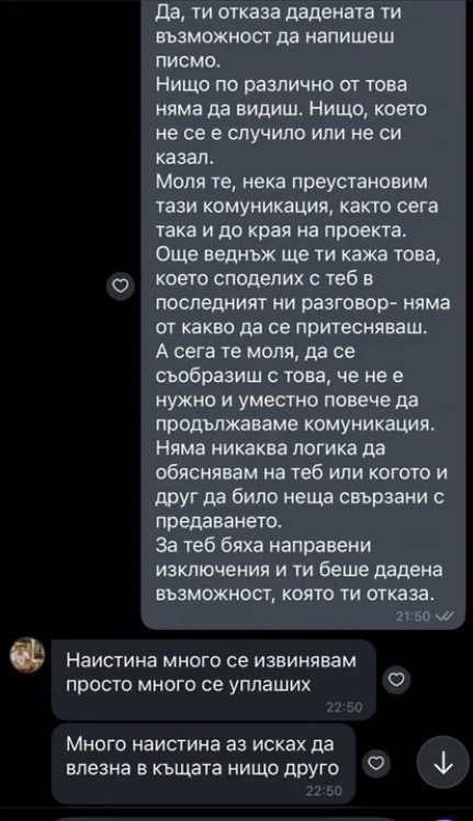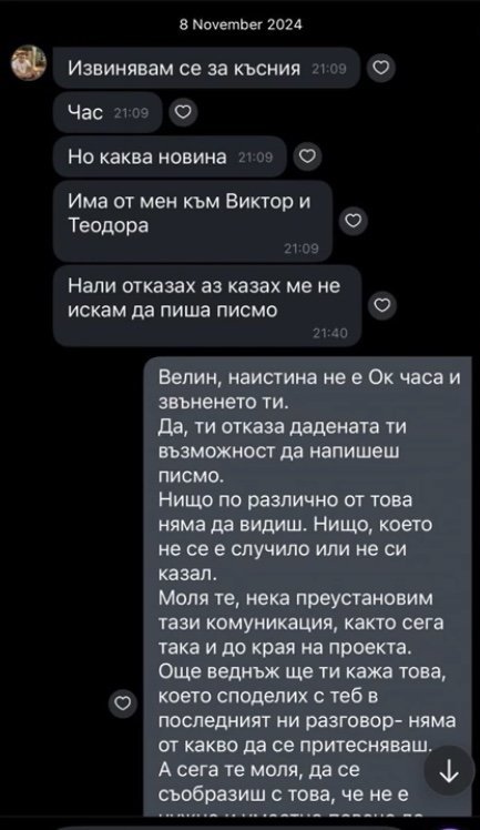 Велин по телефона каза, че не е Ромео и няма да пише писма. 😁 А искал да се види с нея в изолирана стая и разговорът да не се записва. На Теодора ѝ призля, като го чу. В сутрешния блок беше на 100% убедена, че ще остане с Велин. Сега каза, че трябва да говори и с двамата.