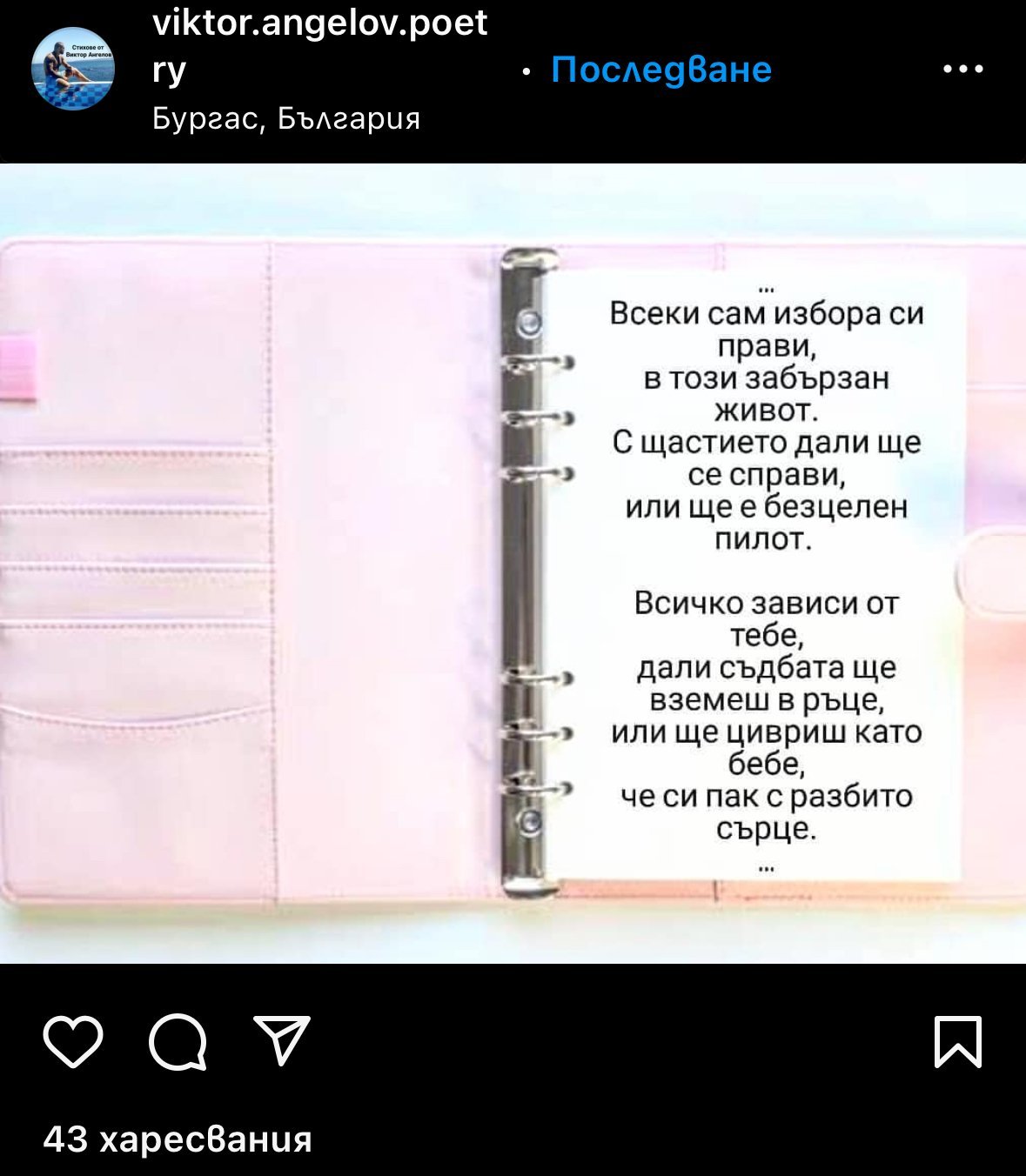 А, ето и стиховете: https://www.instagram.com/viktor.angelov.poetry/?hl=bg