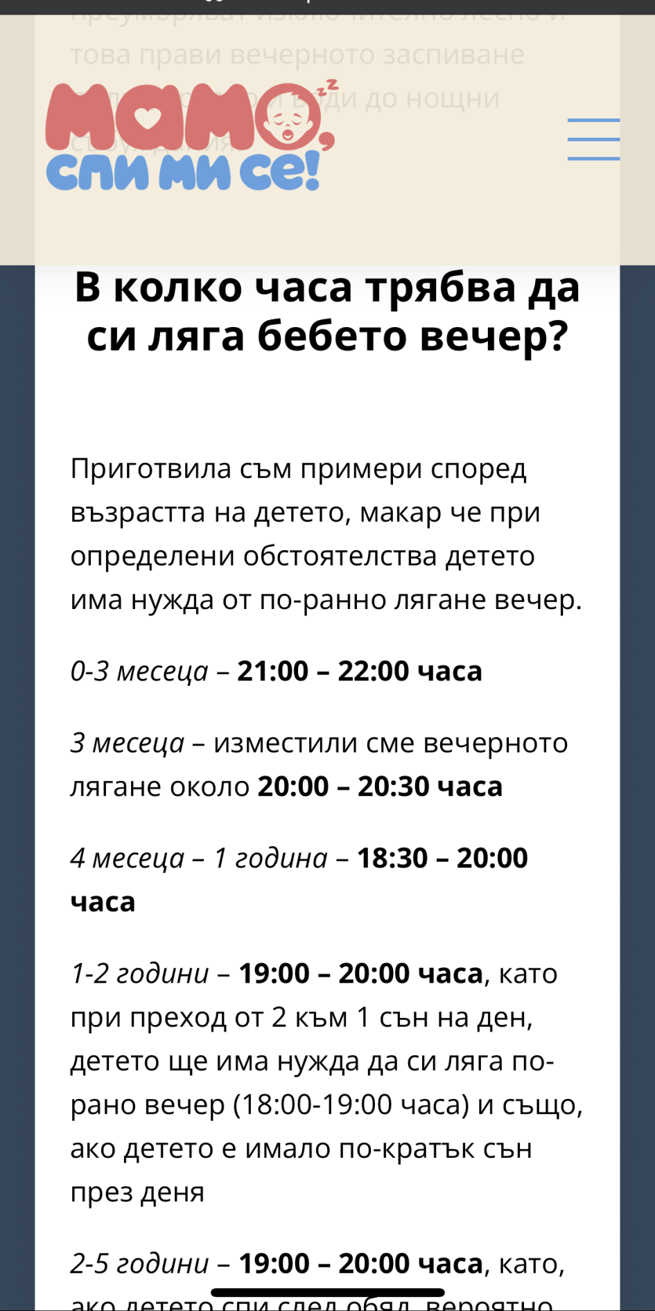 Милива, пробвала съм да извършваме вечерната рутина по-рано и да го слагам да ляга около 20-21 часа. Още по-зле става. Събужда се след 30-40 мин., защото го приема за дрямка и после отново не иска да заспива по 2-3 часа и се борим до посред нощите. И ние сме на долна граница на съня, даже понякога и не мога и толкова да го накарам да спи и може и да се преуморява, но просто не мога да го накарам да спи повече.