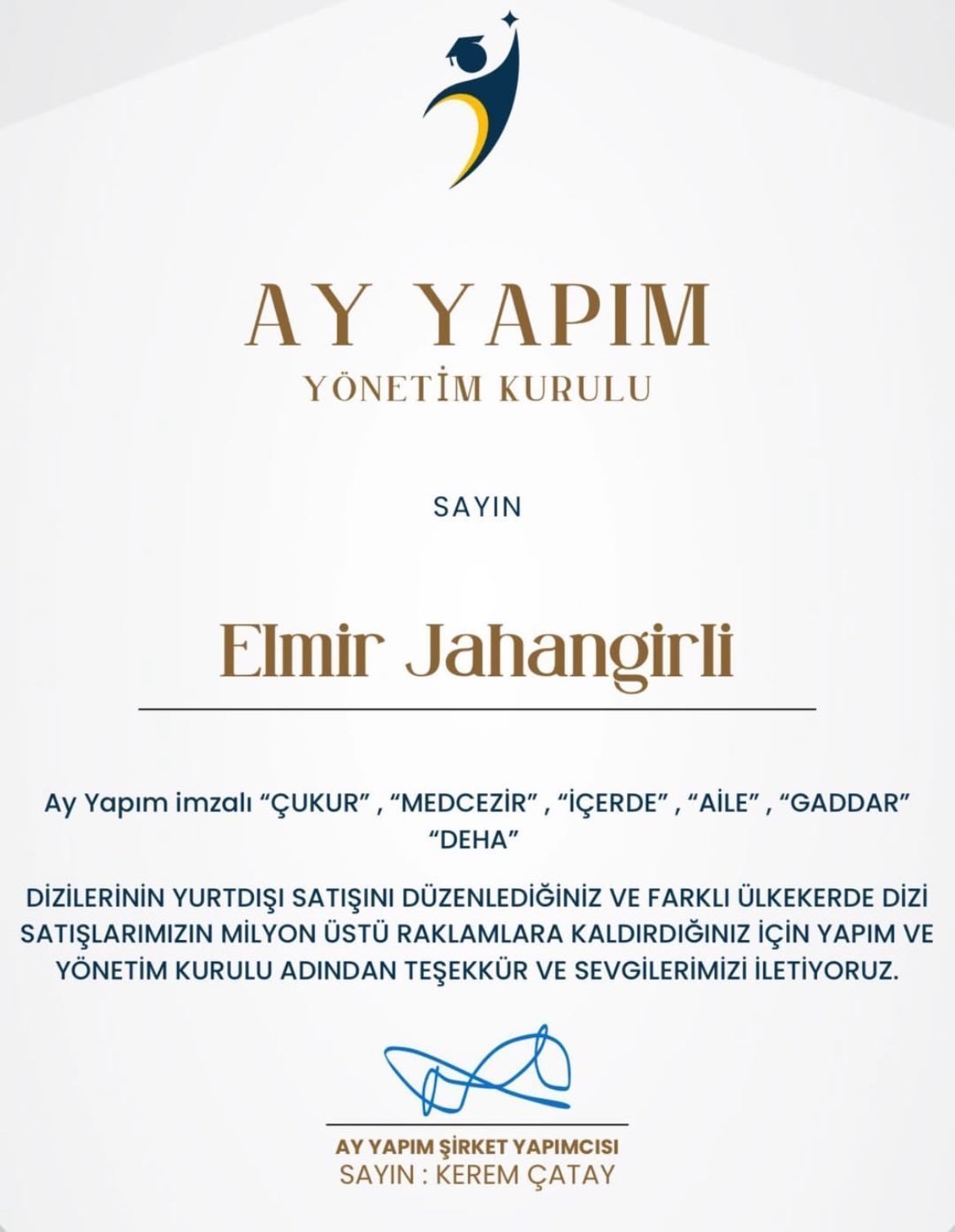 г-н EImir Jahangirli, ВИЕ ОРГАНИЗИРАХТЕ МЕЖДУНАРОДНИТЕ ПРОДАЖБИ НА СЕРИАЛИ „ÇUKUR“, „MEDCEZİR“, „İÇERDE“, „AİLE“, „GADDAR“ „DEHA“, подписан от Ay Yapım, И УВЕЛИЧИХТЕ ПРОДАЖБИТЕ НА НАШИТЕ ТВ сериали ДО НАД МИЛИОНИ В РАЗЛИЧНИ ДЪРЖАВИ. ОТ ИМЕТО НА ПРОДУКЦИЯТА И СЪВЕТА НА ДИРЕКТОРИТЕ ИЗПРАЩАМЕ НАШИТЕ БЛАГОДАРНОСТИ И ЛЮБОВ