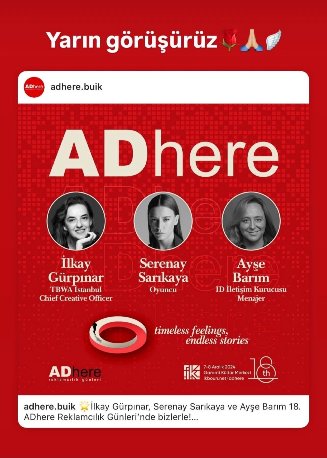 Вчера Серенай беше споделила, че ще вземе участие на 7-8 декември  заедно с мениджърката си Айше Баръм ,основателка на ID İletişim, и творческият директор на TBWA Istanbul Gurpinar, в конференцията ADhere „18. ADhere Reklamcılık Günleri", в Културния център, за да споделят своите виждания, които формират индустрията.