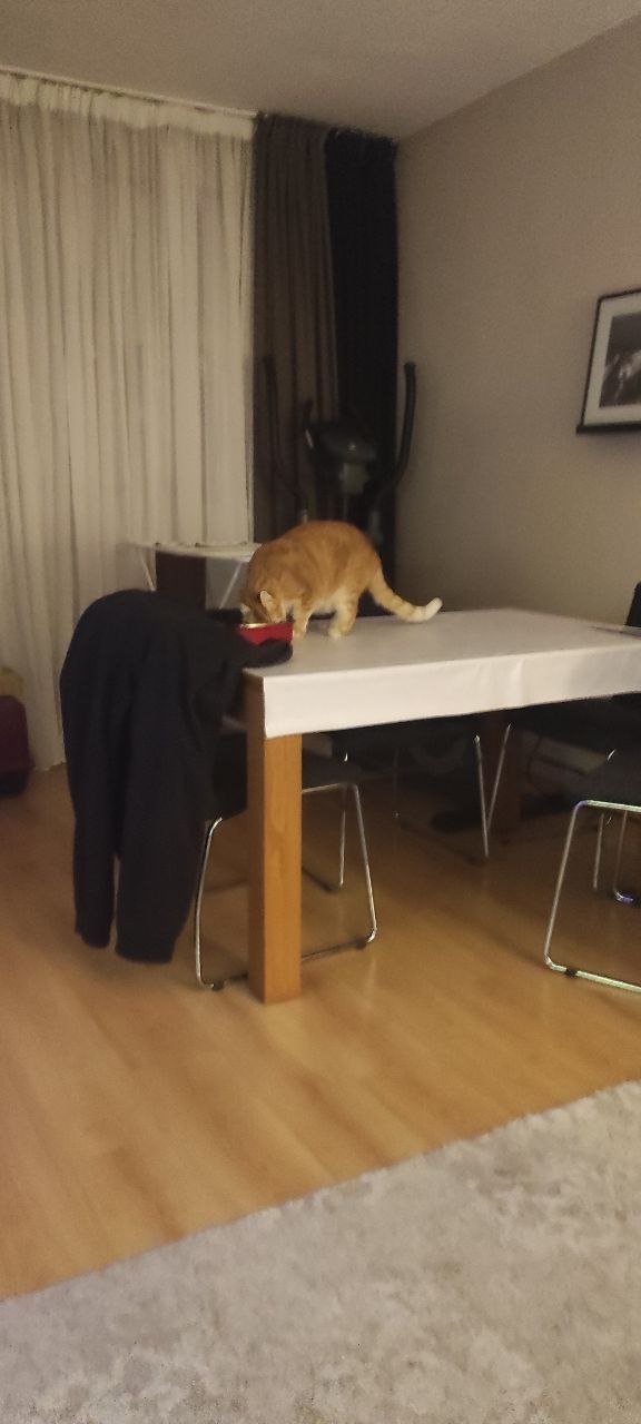 (Не знам дали има общо, но все пак го споменавам - преди да замина сменихме купичките му и му взехме фонтан за вода и автоматична хранилка, от които се храни, но нямаше проблем в началото, сега виждам че продължава да си ги използва)