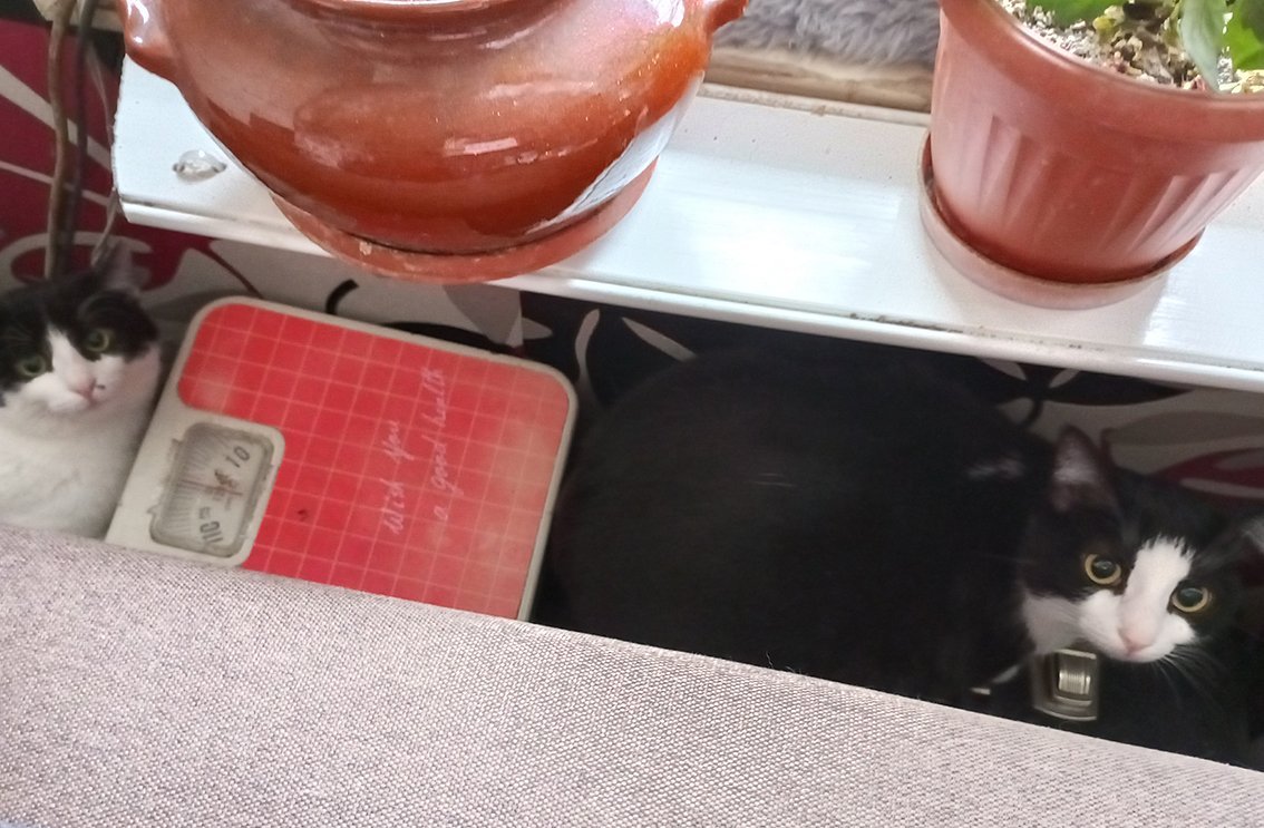 Тук прахосмукачката в хола работеше Grinning * Скрити зад дивана.