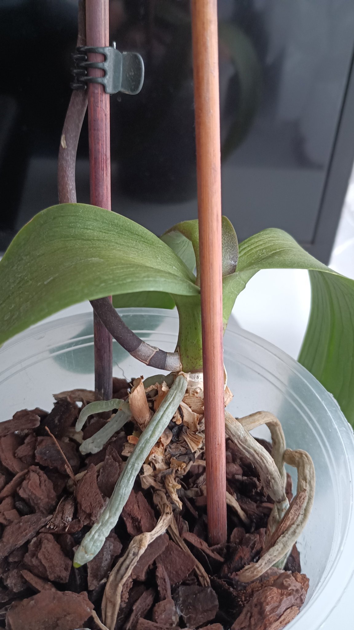 Според мен здрав корен вътре в саксията няма. Бих извадила веднага и счупване/срязване някъде при червената черта... Това черно долу на стеблото не ми харесва. Не е нормално най-новото листо да е с такова спаружено състояние.