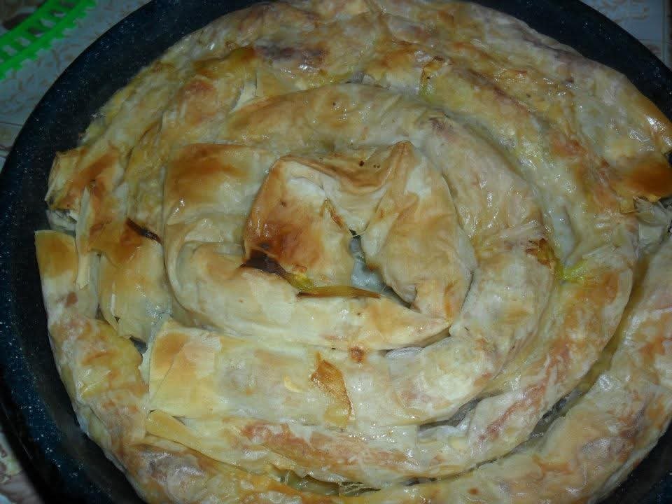 Празът най-напред се запържва до пълно омекване, после се слага лъжичка червен пипер и се сваля от огъня да изстине. Добавя се сиренце,  2-3 яйчица, 2 лъжички кисело мляко. После се намазват две кори със сместа и се навиват и .... така докато свърши плънката. Добавят се около 150 мл вода в съда където е била плънката и се залива отгоре върху баницата - да се разпредели хубаво. Най-отгоре се капва навсякъде по-малко олио и се пече в предварително загрята фурна. При консумиране върви с айрянче Simple Smile