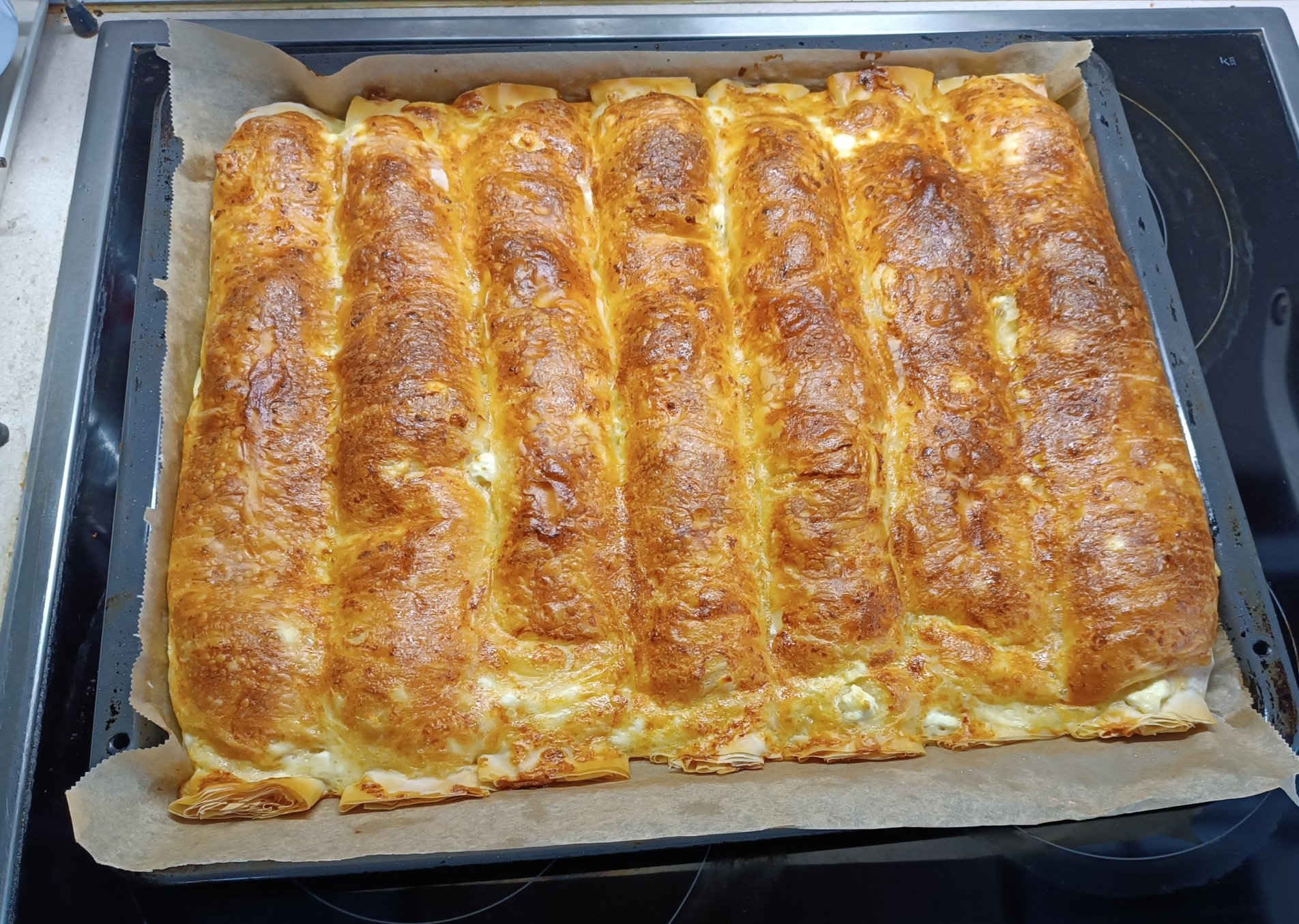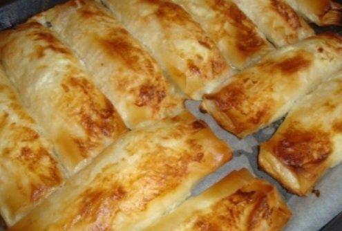 Намажете с разтопено масло, добавете натрошено сирене, настъргания кашкавал и крем сирене.