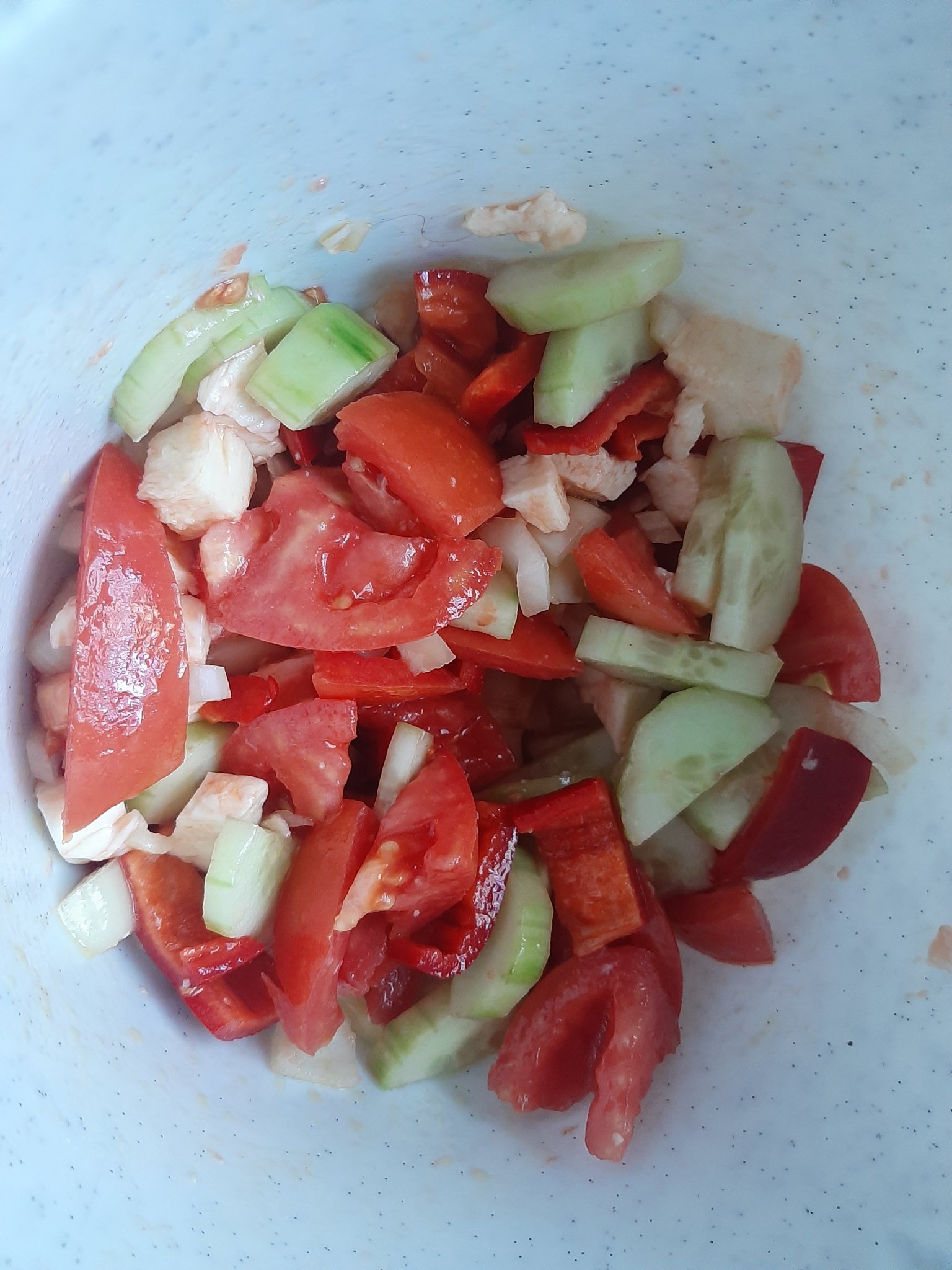 Сипва се брашното в купа, добавяме сухата мая, сол, захар, олио, хладка вода, разбърква се с вилица на тесто, после се измесва на средно меко тесто и се оставя да втаса за 30 минути.