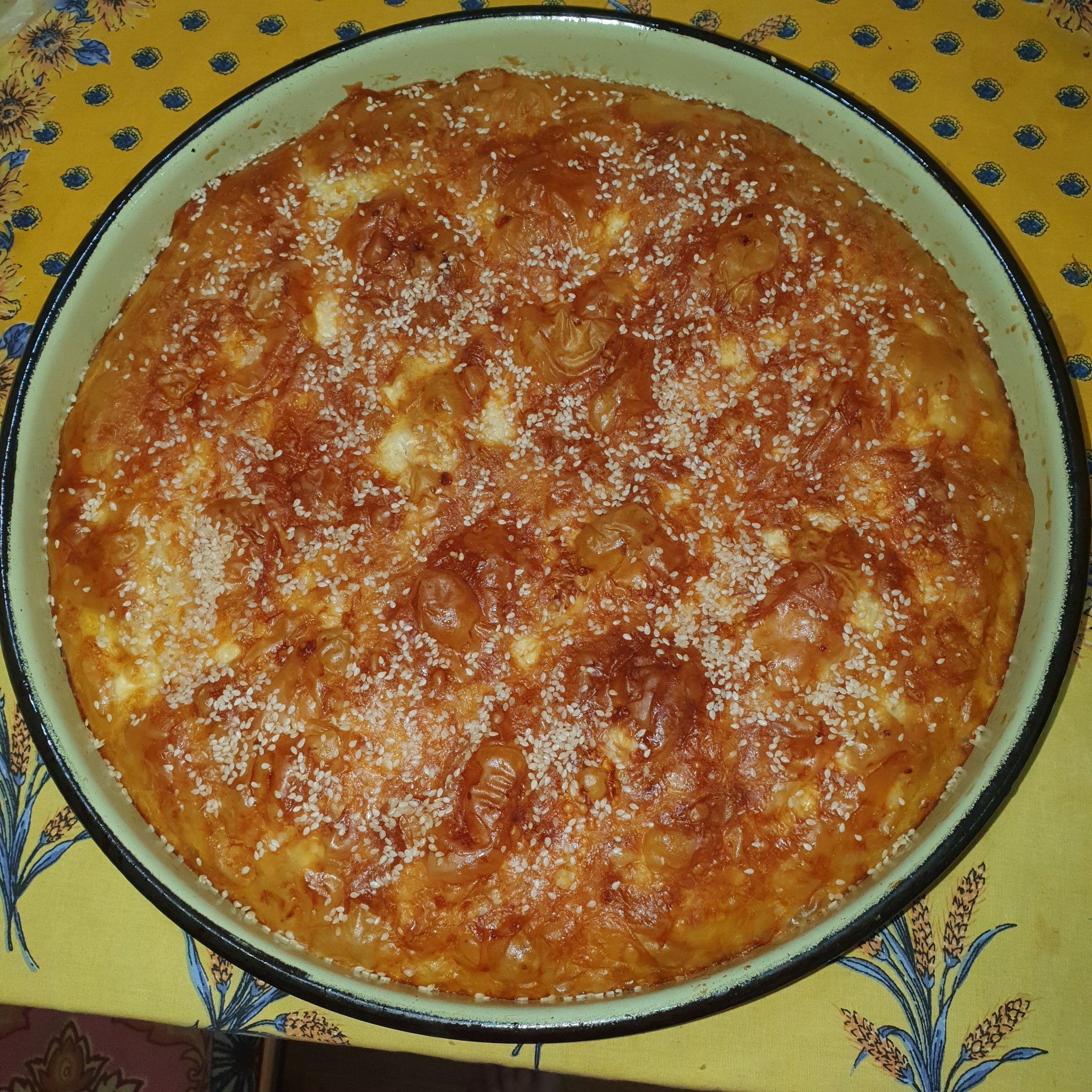 Отгоре се залива със застройка от разбитите яйца с кисело мляко. Запеканката се поръсва с настърган кашкавал и се пече до златисто в загрята фурна