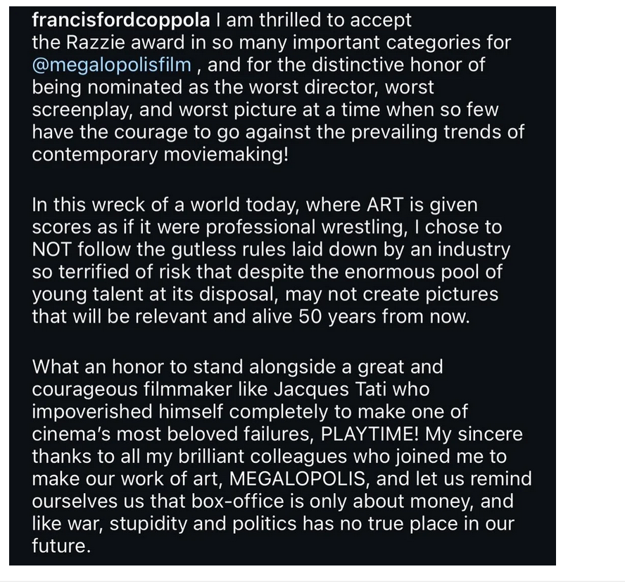 Копола е спечелил Златна малинка за Мегалофлополис Joy Е, поне е осъществил мечтата си да направи този филм (четох някъде, че за него бил много специален проект - вложил много собствени пари)...