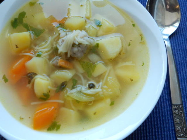 Друг път пък ползвам сурова наденица, която си е овкусена, изваждам я от червото и я размесвам с ориз и оформям топчетата.... или  директно късам топчета и пускам в супата.